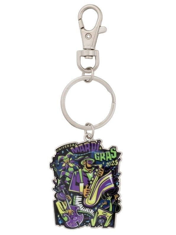This keychain is a festive design of purple, green, and yellow. The “Universal Mardi Gras 2025” wordmark is depicted at the top. A saxophone player and bass player are featured on the keychain with a piano keyboard between them. In the upper left corner is the festival jester. In the bottom right corner is the Universal Studios Florida arch with hands reaching out to catch beads above it and a shimmering disco ball beneath it.