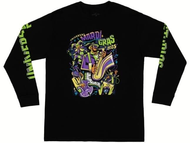 This black long-sleeve shirt features a colorful festive design on the front of the saxophone player, bass player, jester, and Universal Mardi Gras 2025 logo. The shirt sleeves read “Universal Studios” in bright green font.