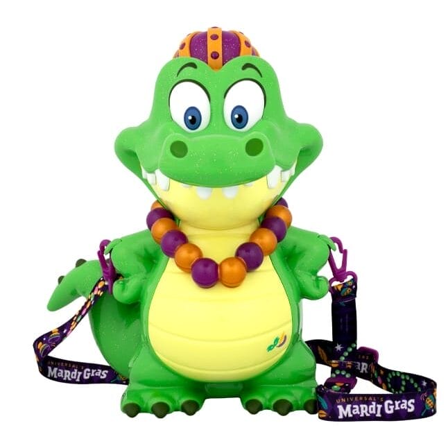 This popcorn bucket features a sparkling Gator Junior with purple and gold light-up beads and a crown. The bucket strap has an all-over print including Mardi Gras beads and feathers. The “Universal’s Mardi Gras” wordmark is also depicted throughout the design.
