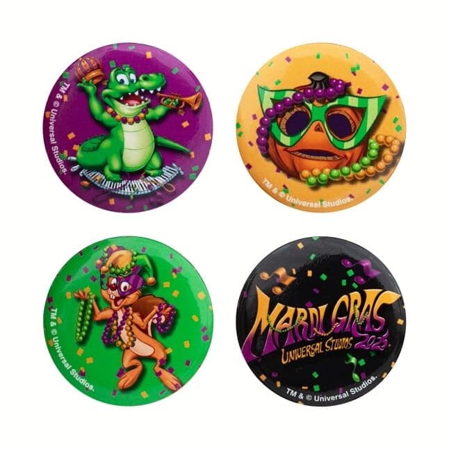This button set contains four buttons featuring the Universal Studios icons. One is of Gator Junior on a purple background, the second is Earl the Squirrel on a green background, and the third is Lil Boo on a yellow background. The fourth pin contains the Mardi Gras 2025 Universal Studios logo in yellow and purple on a black background.