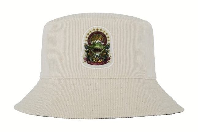 This bucket hat is cream-colored corduroy and features a King Gator embroidered patch. The interior features an all-over screenprint Mardi Gras design.