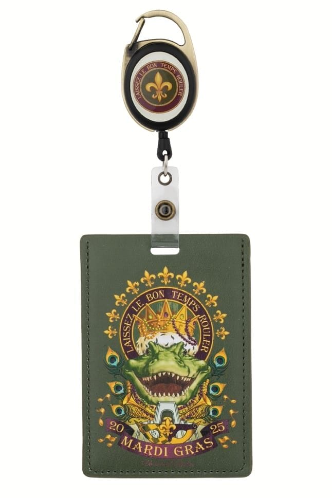 This badge reel features a printed decal of King Gator on a faux leather card holder with a clear window. The badge reel is retractable and has the Fleur de Lis emblem with “Laissez le bon temps rouler” surrounding it.