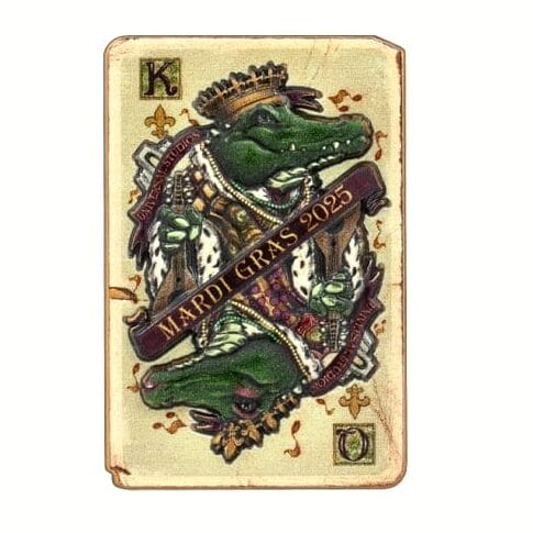 King Gator and his queen are depicted on this limited edition pin resembling a playing card. “Mardi Gras 2025” is written on a banner at the center of the pin.