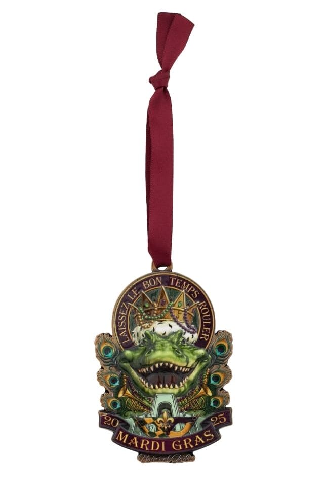 King Gator is featured on this ornament. The Louisiana French Creole phrase “Laissez le bon temps rouler” is depicted above him with “2025 Mardi Gras” on a banner below him.