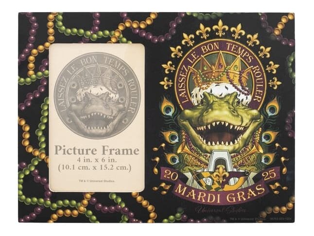 This photo frame features King Gator surrounded by purple, green, and gold beads. Above him is the Louisiana French Creole phrase “Laissez le bon temps rouler” which translates in English to “let the good times roll.” Depicted below him on a banner is “2025 Mardi Gras.”