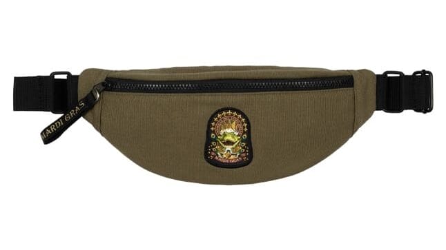 This waist bag has an adjustable strap and features an embroidered patch of King Gator. The zipper on the front has the words “Mardi Gras.”