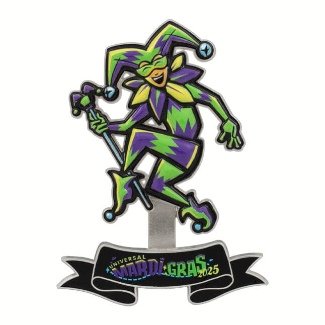 A festival jester is featured on this Mardi Gras standing pin. The jester’s outfit is green, yellow, and purple, and he holds a matching scepter in his hand. Below him on a black banner is the “Universal Mardi Gras 2025” logo.