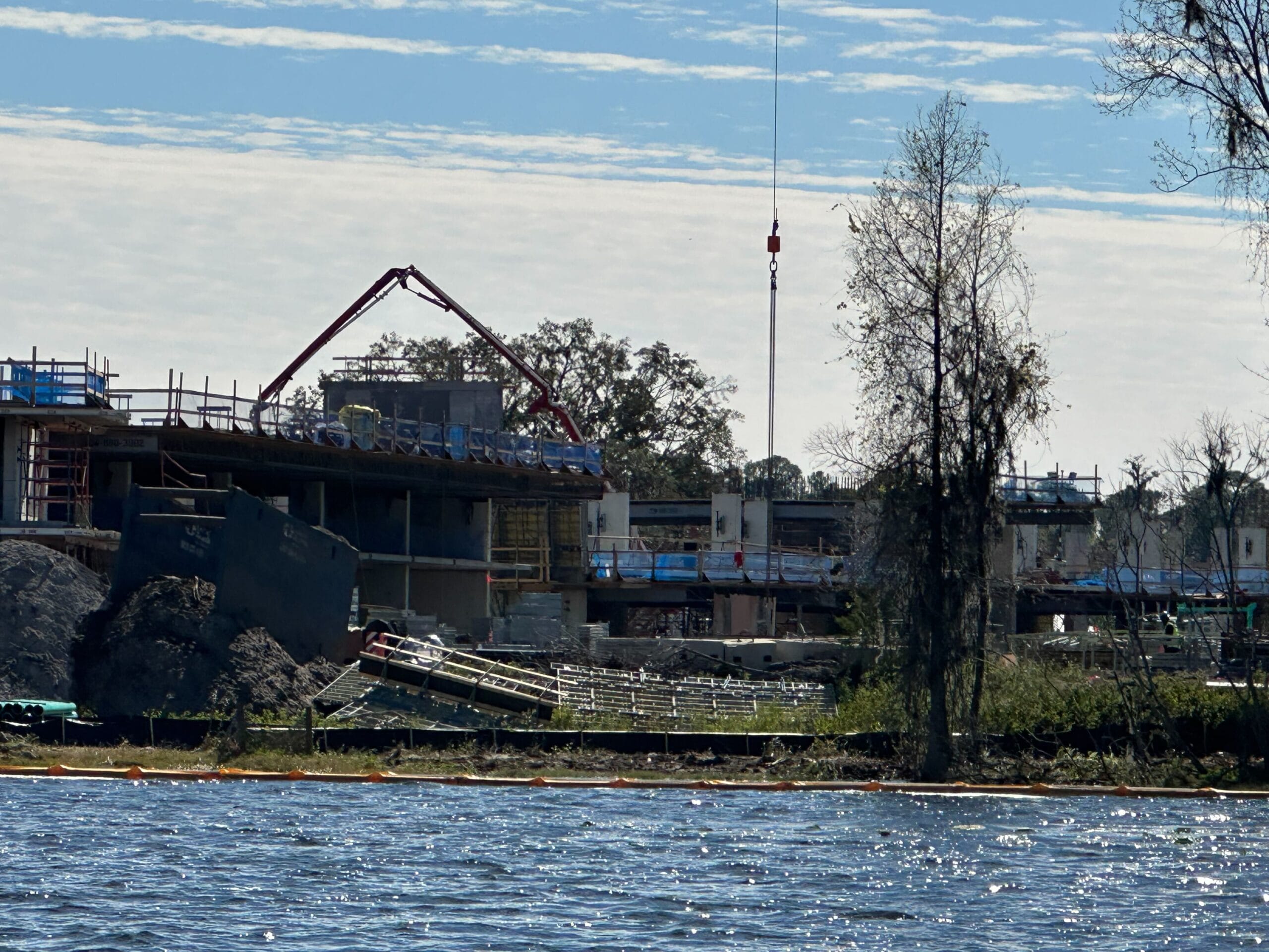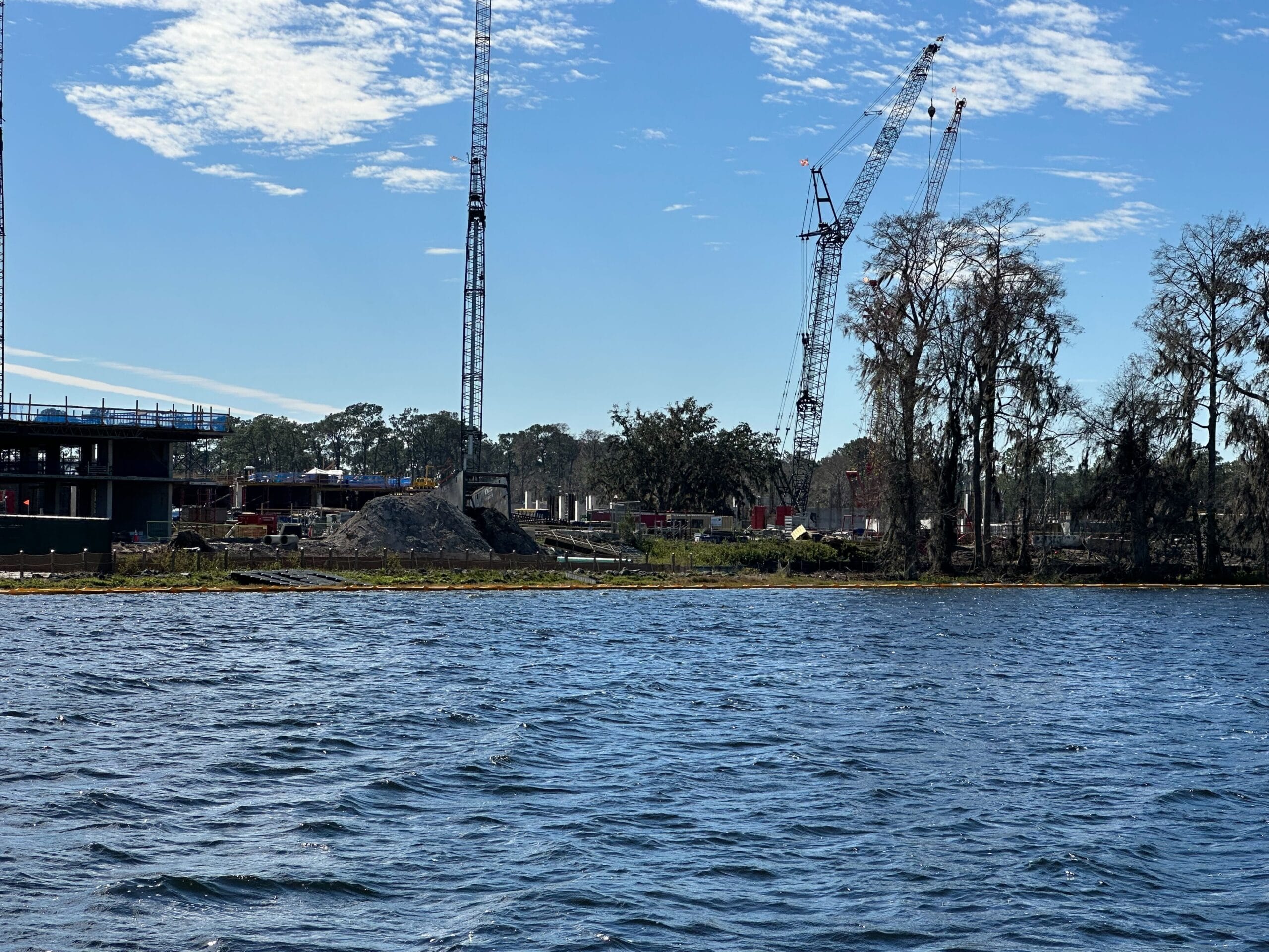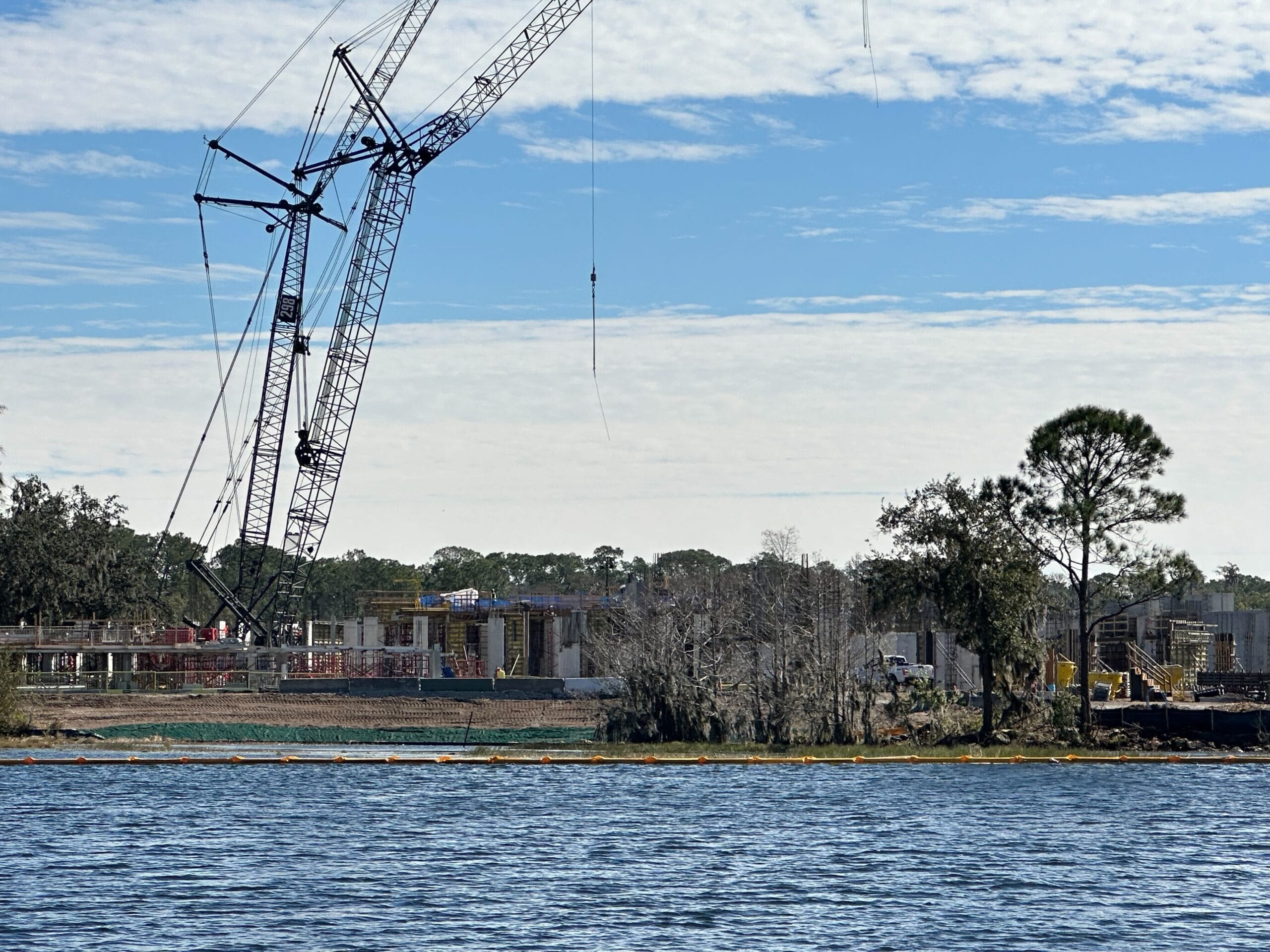 Disney Lakeshore Lodge replaces the previously planned Reflections – A Disney Lakeside Lodge. It’s under construction at the former River Country site near Disney’s Fort Wilderness Resort. There are several cranes at the construction site. In this area, there isn’t significant structure work, just a lot of dirt piles.