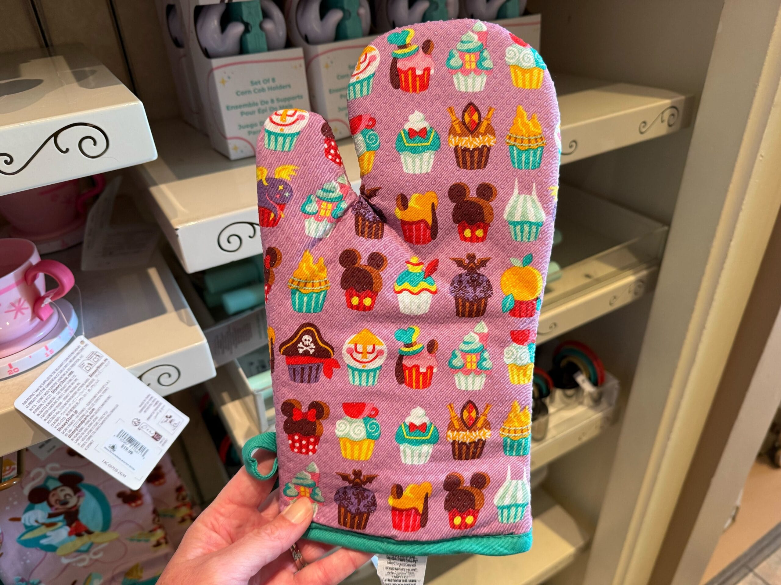 A colorful oven mitt with cupcake designs, some resembling mouse ears, is held by a person. It is showcased as part of the Mousewares collection in front of a store shelf filled with other kitchen items.