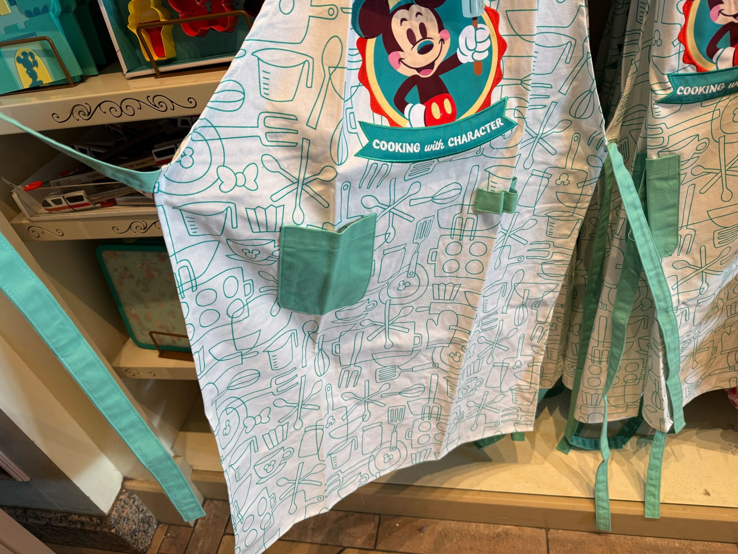 The tie and pockets of the apron are all the same shade of teal. The apron has one small pocket on the left side and an elastic band for holding utensils on the right side. The pattern across the white fabric shows outlines of kitchen supplies like bows, forks, measuring cups, and a few Mickey icons.