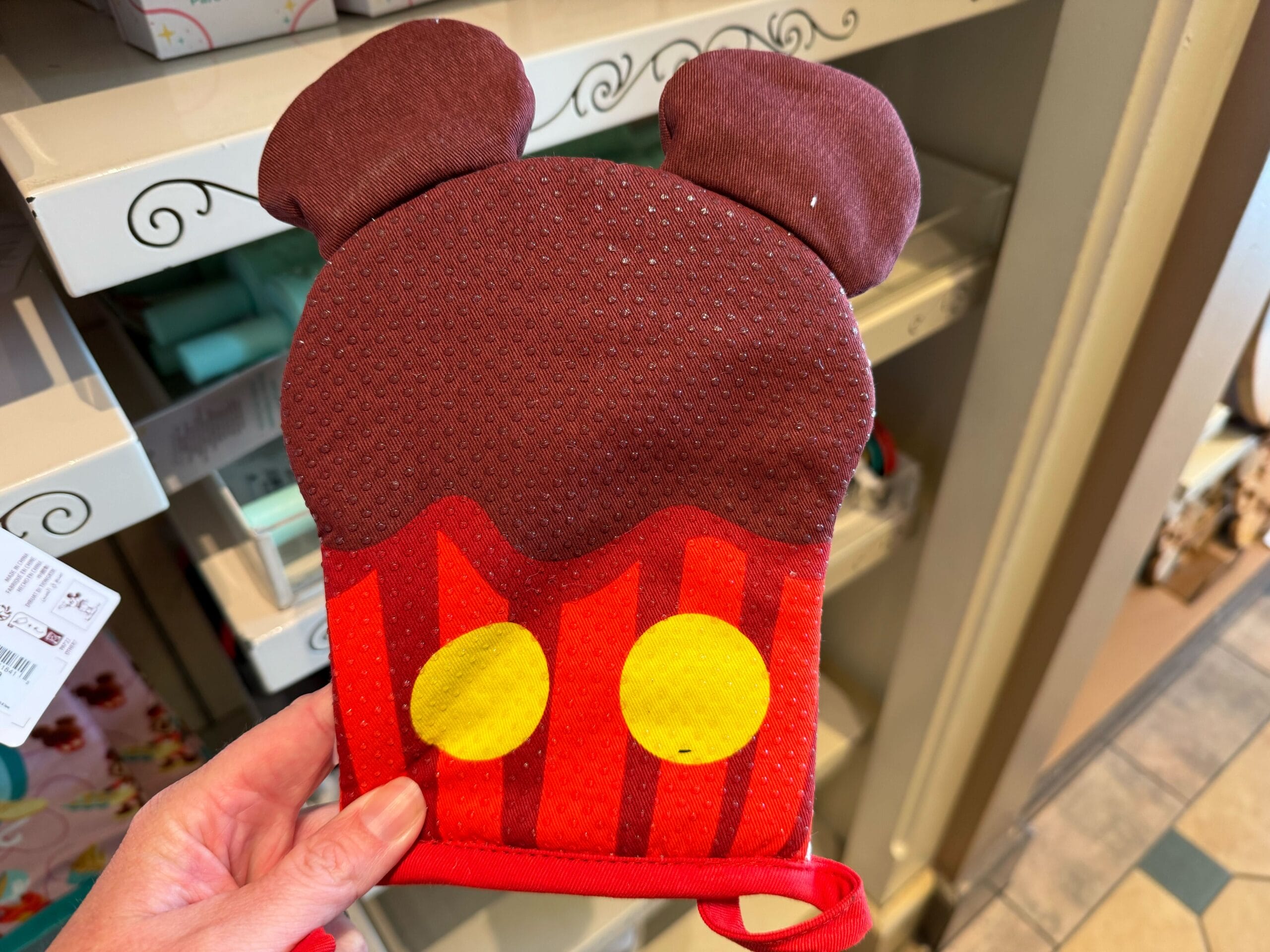 A hand holding a brown and red Mousewares oven mitt with yellow circles and mouse ears, reminiscent of a beloved cartoon character.