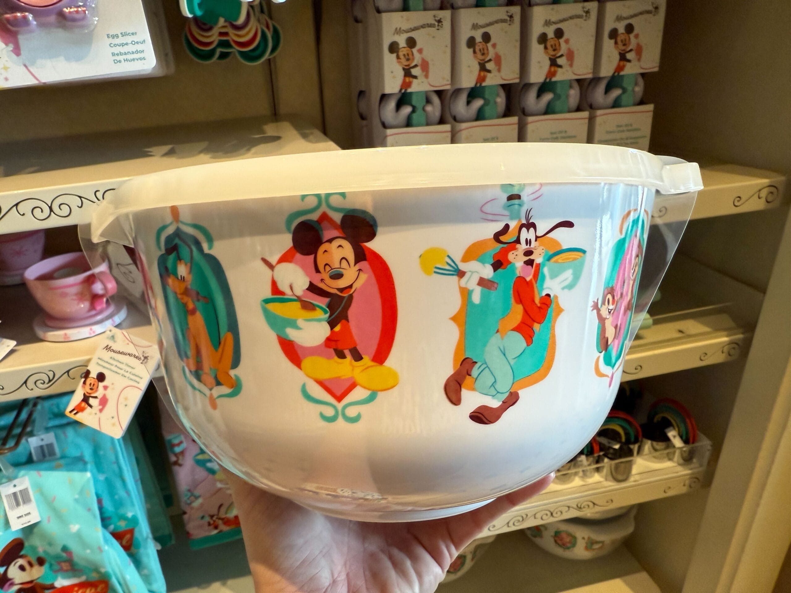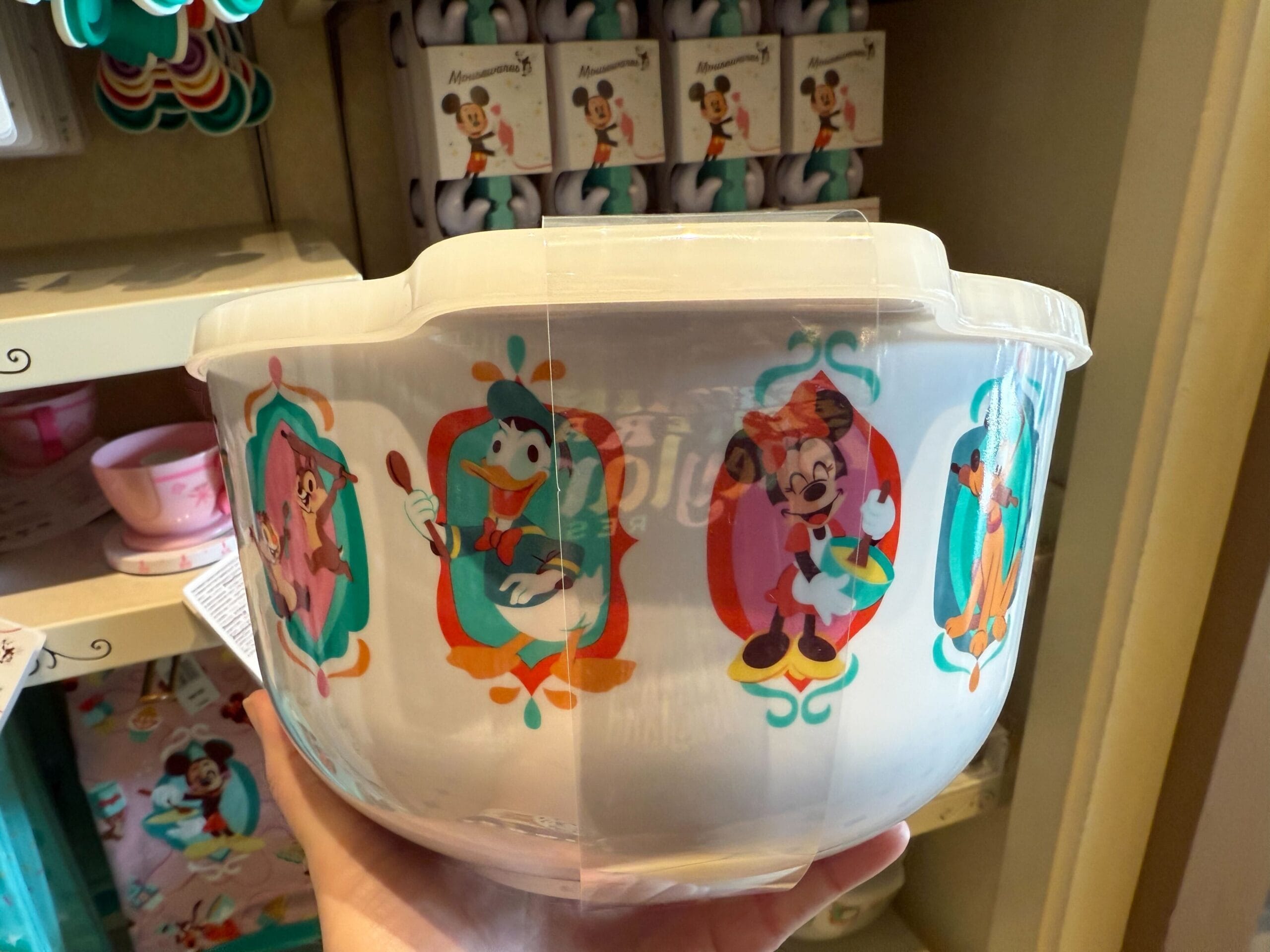 This plastic bowl is a large size, so it is likely for mixing or storing food rather than serving it. Ovals around the bowl show Mickey, Minnie, Donald, Goofy, Pluto, Chip, and Dale all holding kitchen utensils like wooden spoons, mixing bowls, and rolling pins.