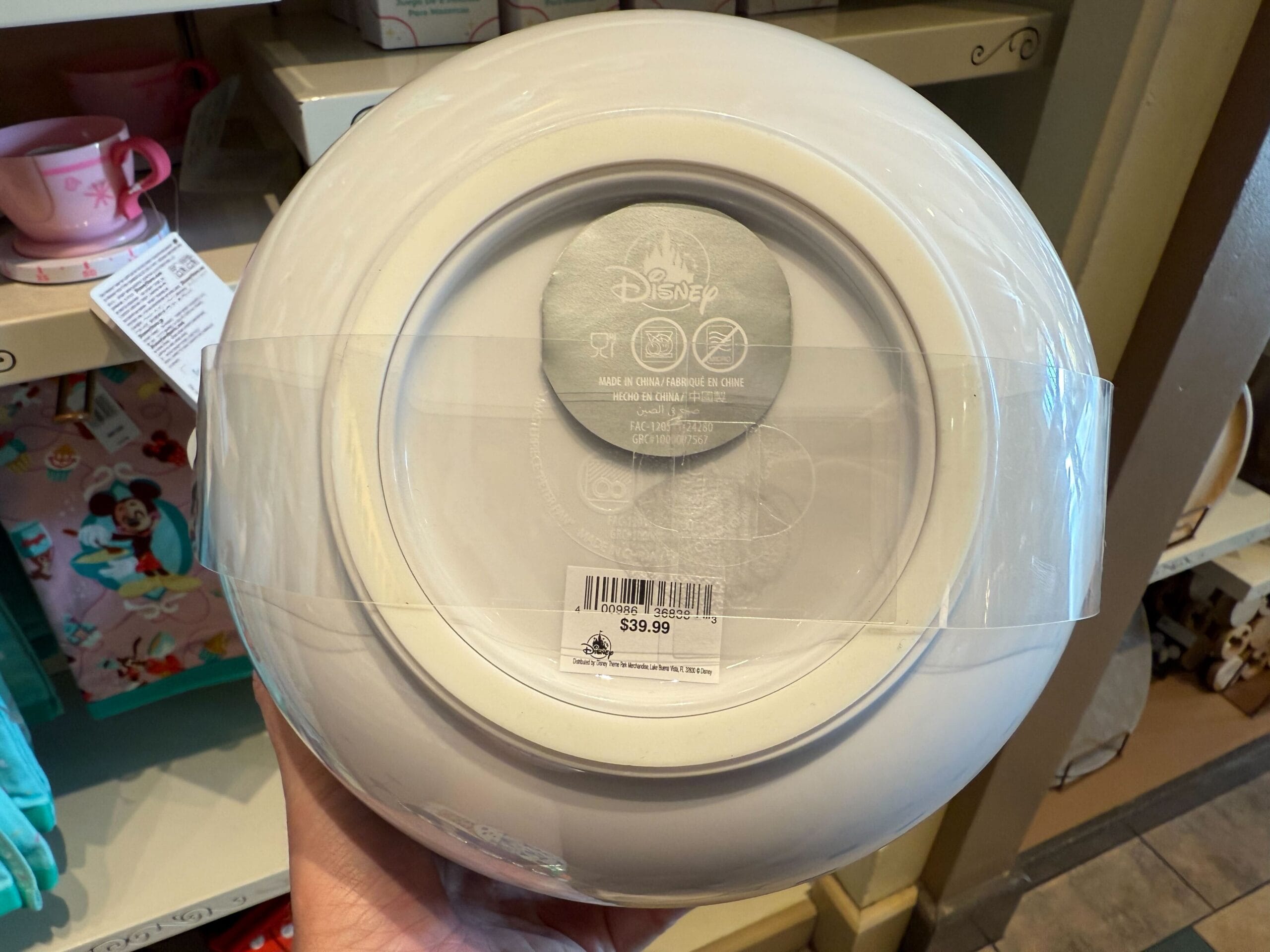 A shopper admires a white Disney collectible plate, part of the exclusive Mousewares line, priced at $39.99 in a store.