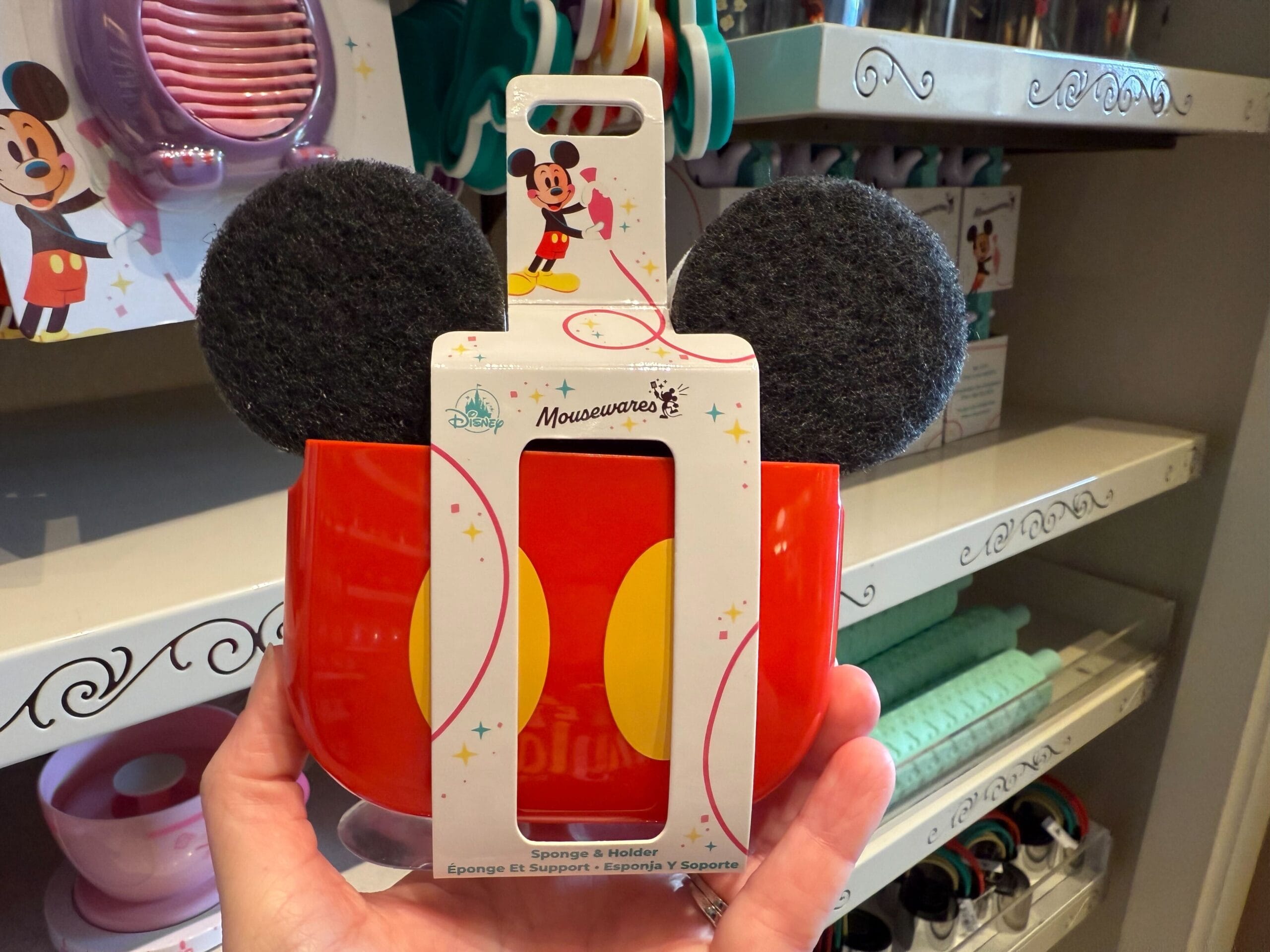 A hand holds a Mickey Mouse-themed sponge holder, part of the whimsical Mousewares collection. It boasts a red and yellow design with iconic black ears, set against shelves brimming with various kitchen items in the background.