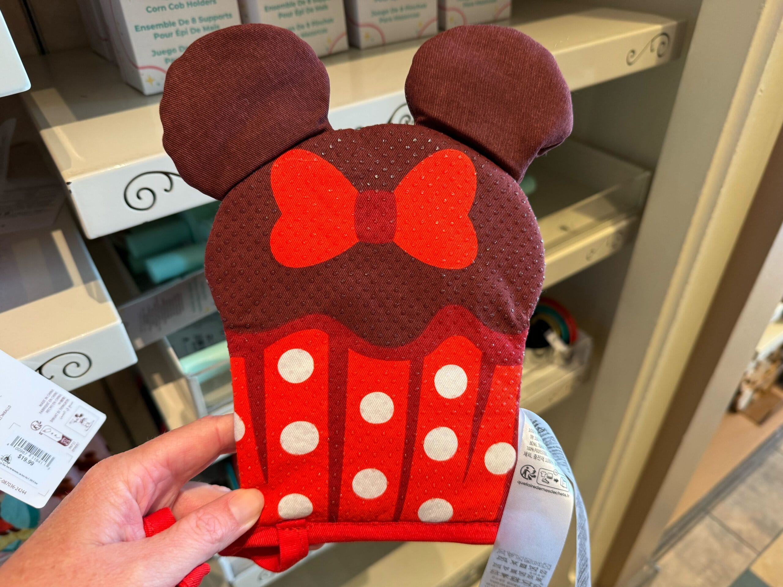 A person showcases a whimsical Mousewares creation—a red and brown oven mitt designed like a cupcake with mouse ears and a bow—in front of shelves.