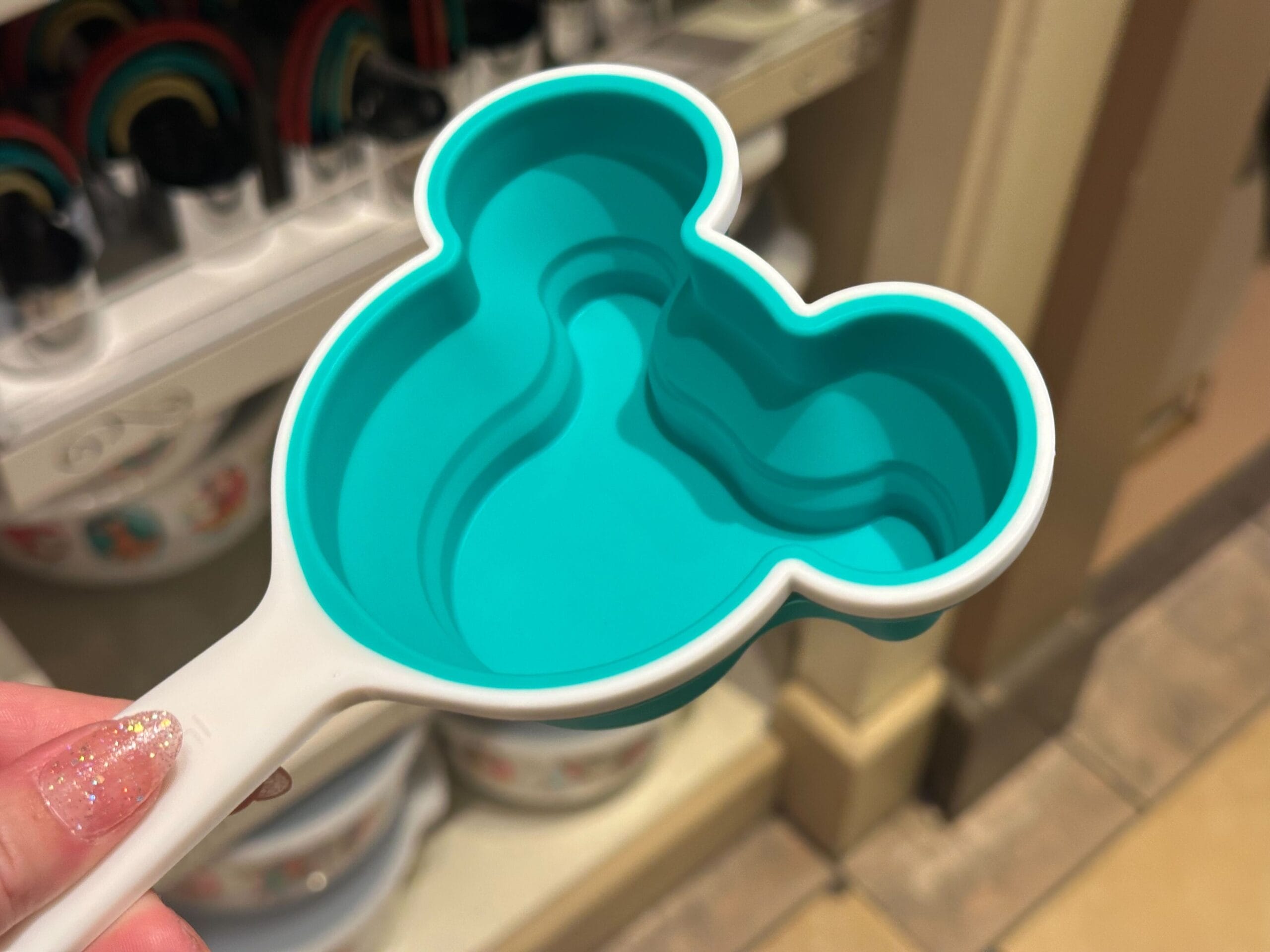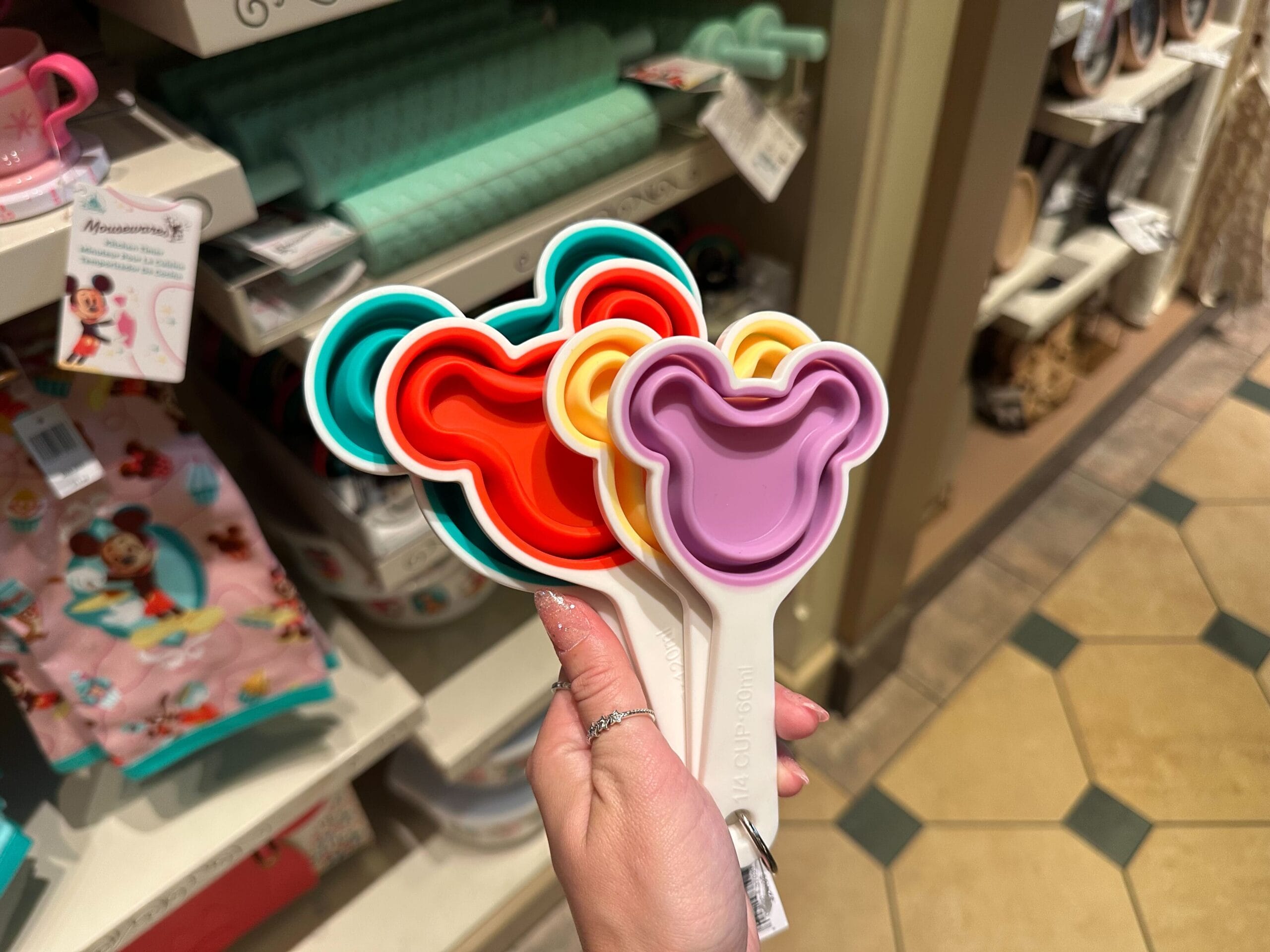 A hand holds a set of colorful, Mickey Mouse-shaped measuring spoons in a Mousewares display at the store.