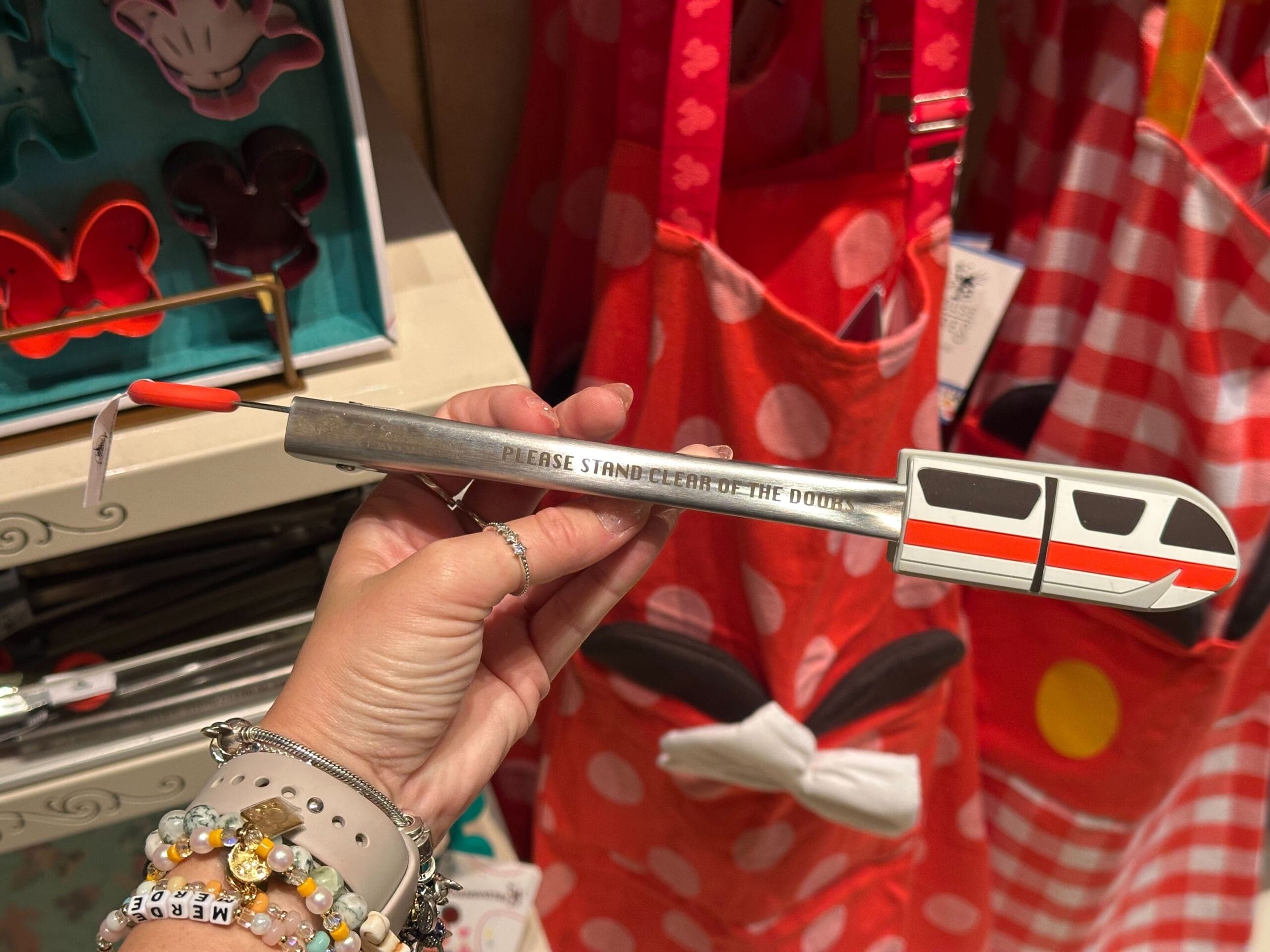 A hand holds a Mousewares monorail-themed pizza cutter with the words "Please Stand Clear of the Door" on the handle.