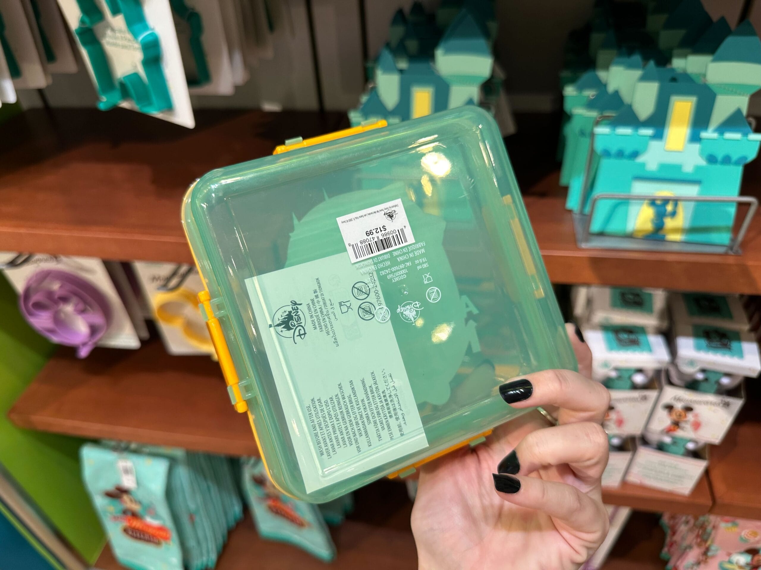 A person holds a transparent green square container with a yellow latch, featuring a sticker with text and symbols. Shelves lined with various Mousewares, showcasing green and turquoise packaged items, are in the background.