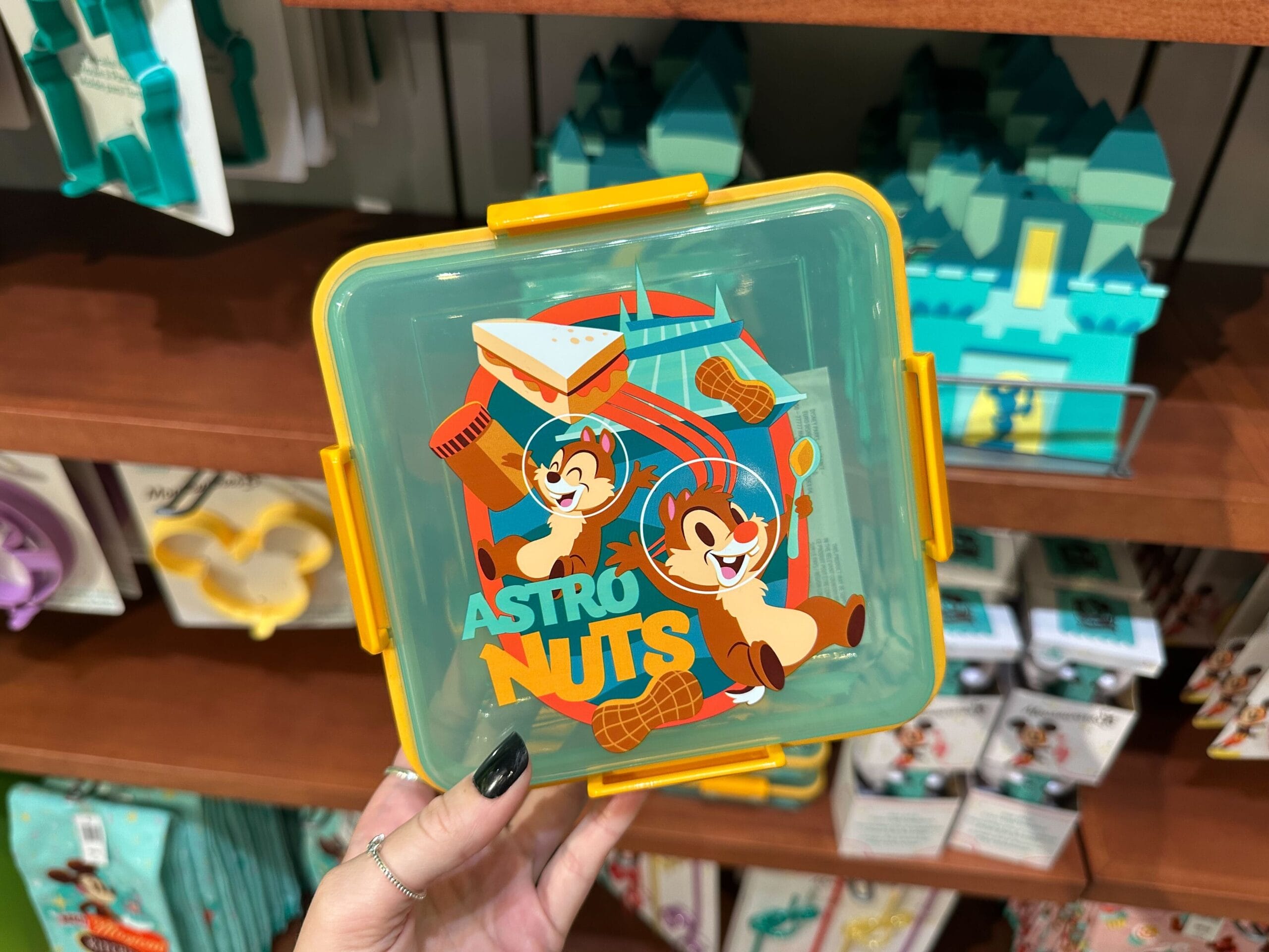 A person holding a green and yellow lunchbox featuring cartoon chipmunks with the text "Astro Nuts," stands in front of a shelf with similar Mousewares.