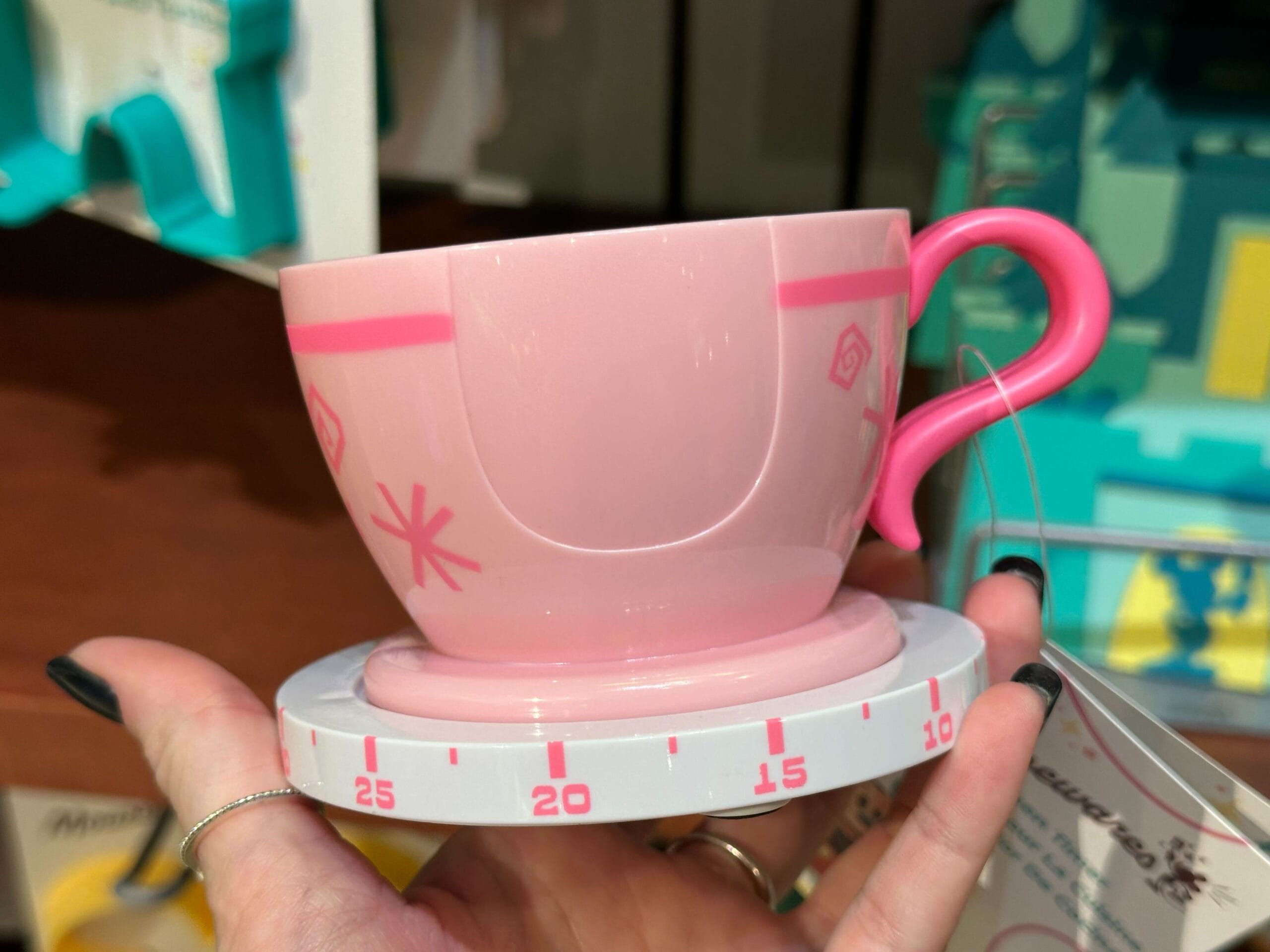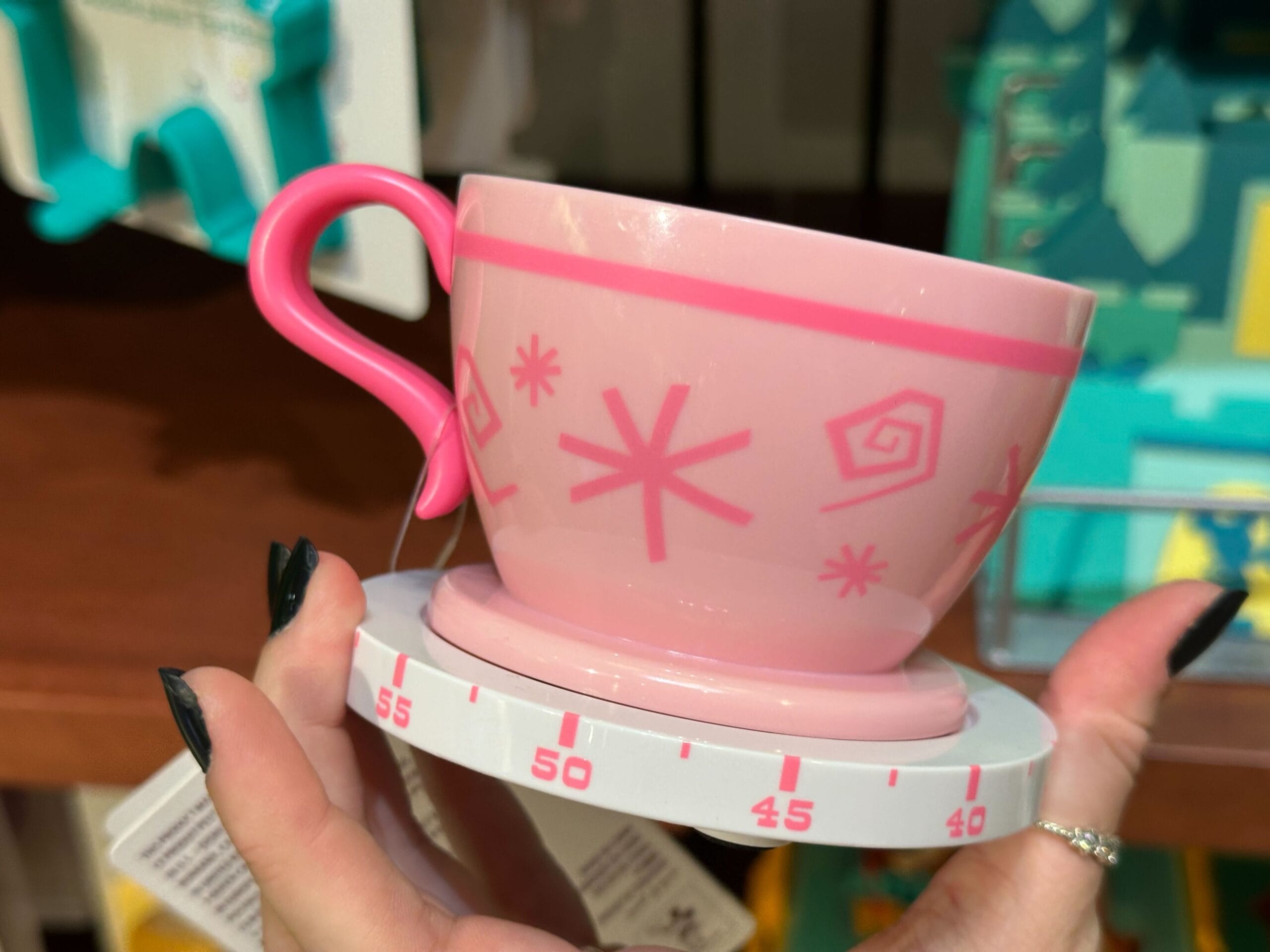 A person holds a pink Mousewares cup-shaped timer with a decorative handle, displaying the number 45, among additional items in a charming store.