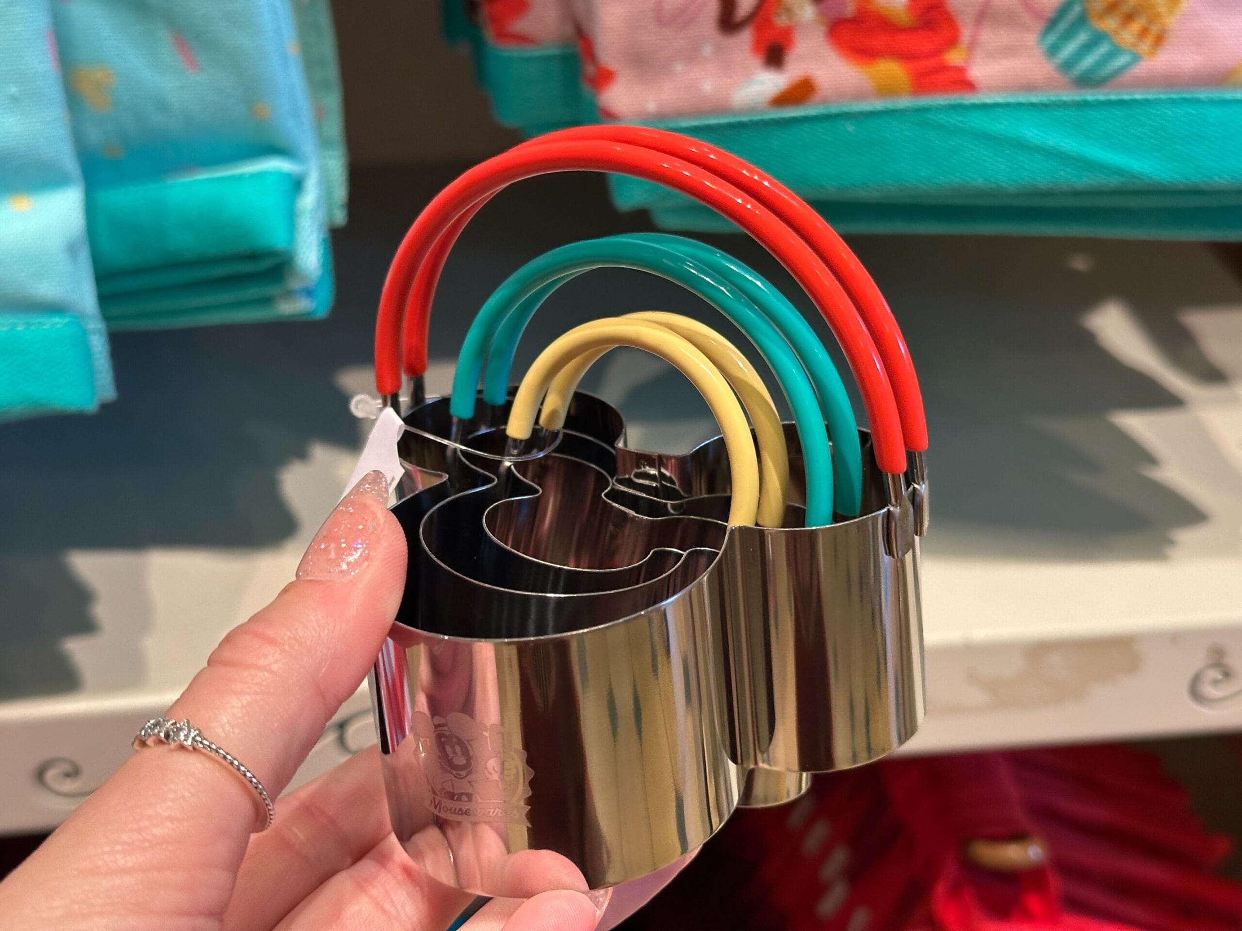 A hand holds a delightful set of Mousewares metal cookie cutters, featuring rainbow arcs in red, green, and yellow, along with an iconic Mickey Mouse head.