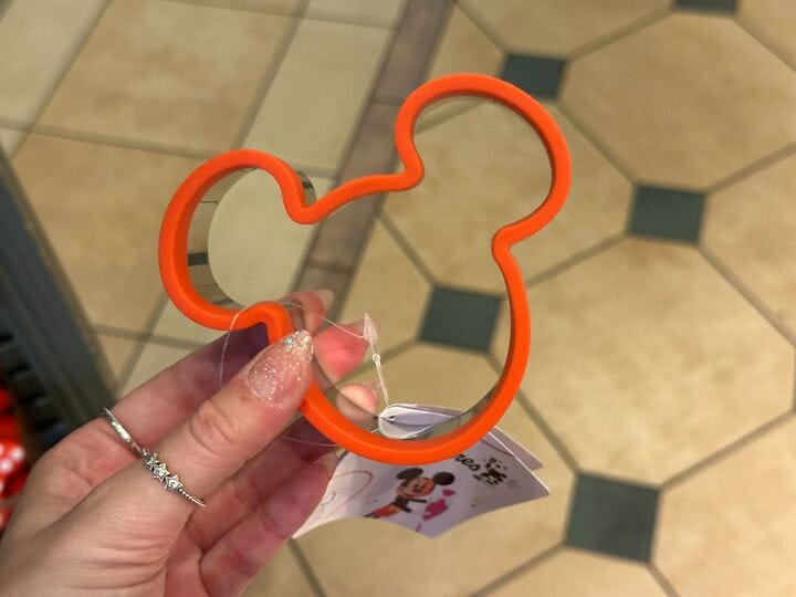 A shopper examines an orange, Mickey Mouse-shaped cookie cutter in a store with a tiled floor, reminiscent of the whimsical charm found in Mousewares.