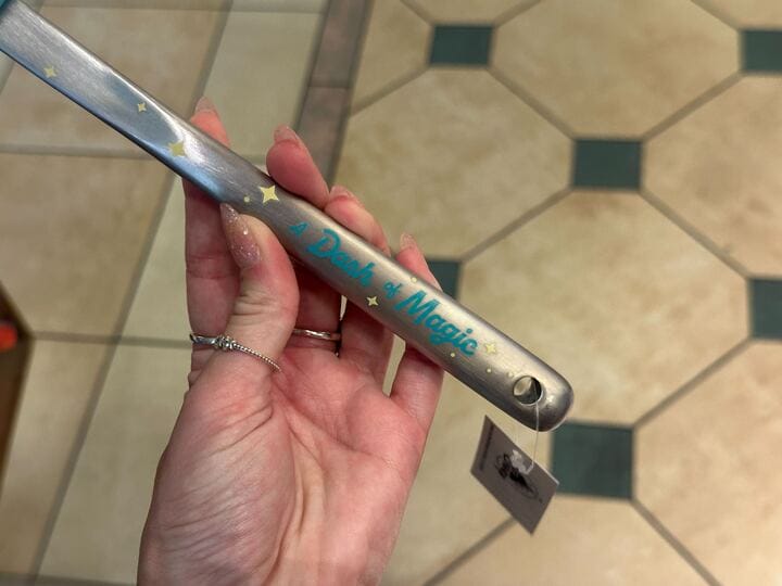 A hand holds a metal wand adorned with star decorations and the playful text "A Dash of Magic" on it. A Mousewares label dangles from the handle, adding charm to the enchanting tool. The background reveals a tiled floor.
