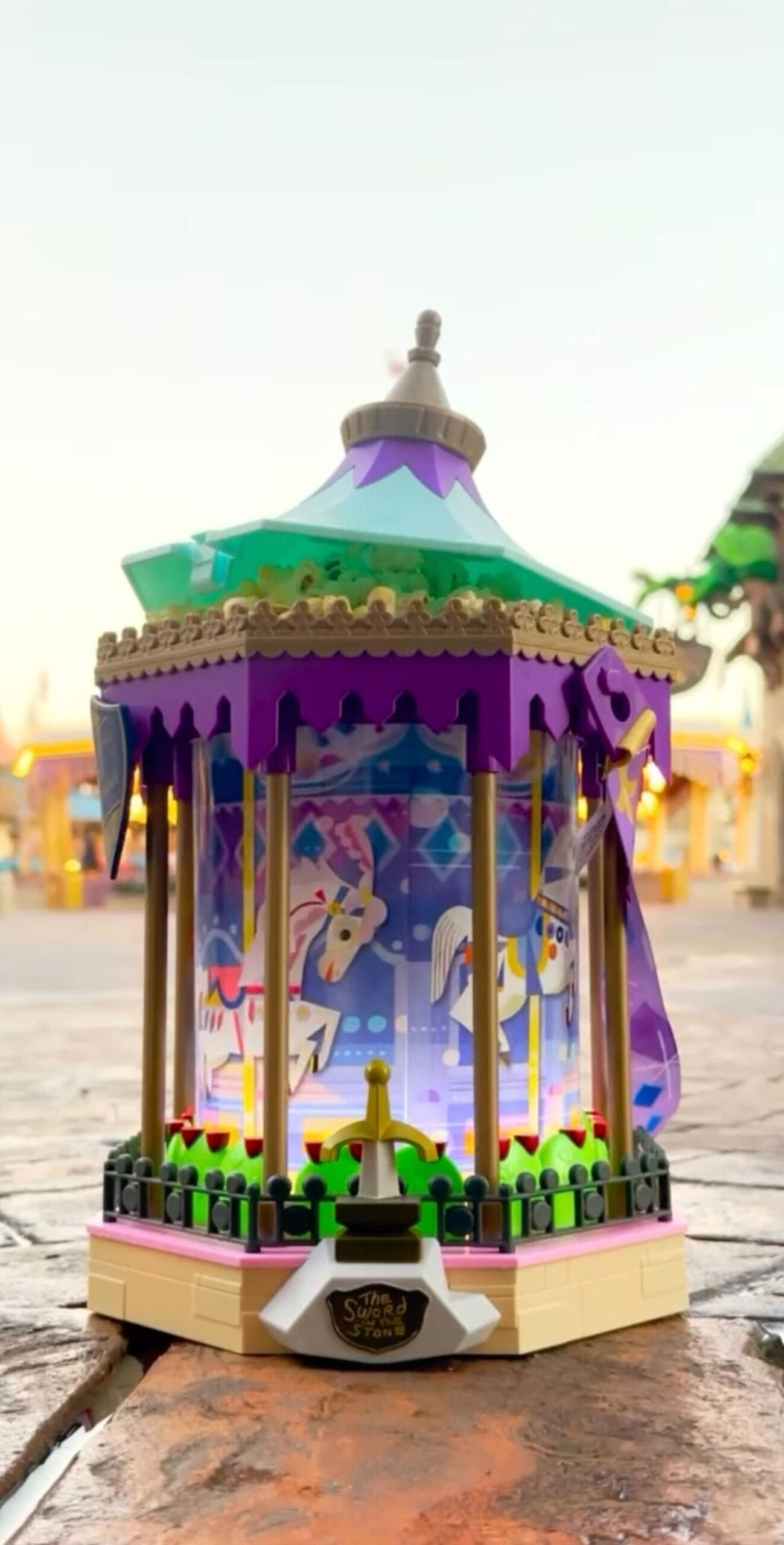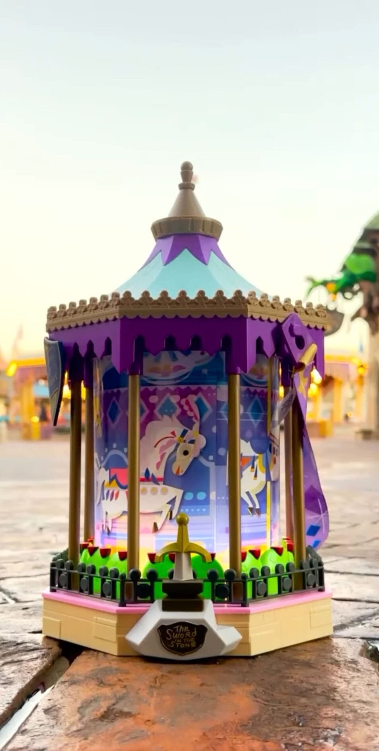 A decorative lantern with a carousel design features colorful horses and purple accents, resting on a stone surface under a clear sky.