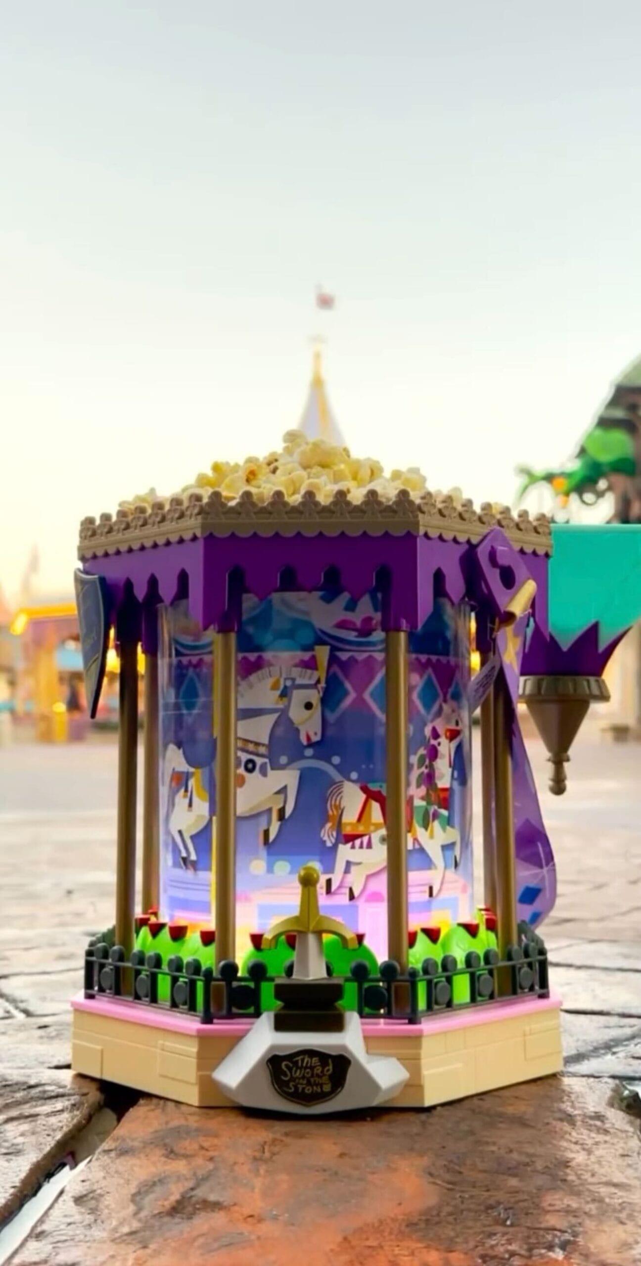 The popcorn bucket is shaped similarly to musical popcorn buckets that have been released in the past, but this time brings the Magic Kingdom carrousel to life. Several horses move past as the center cylinder rotates.