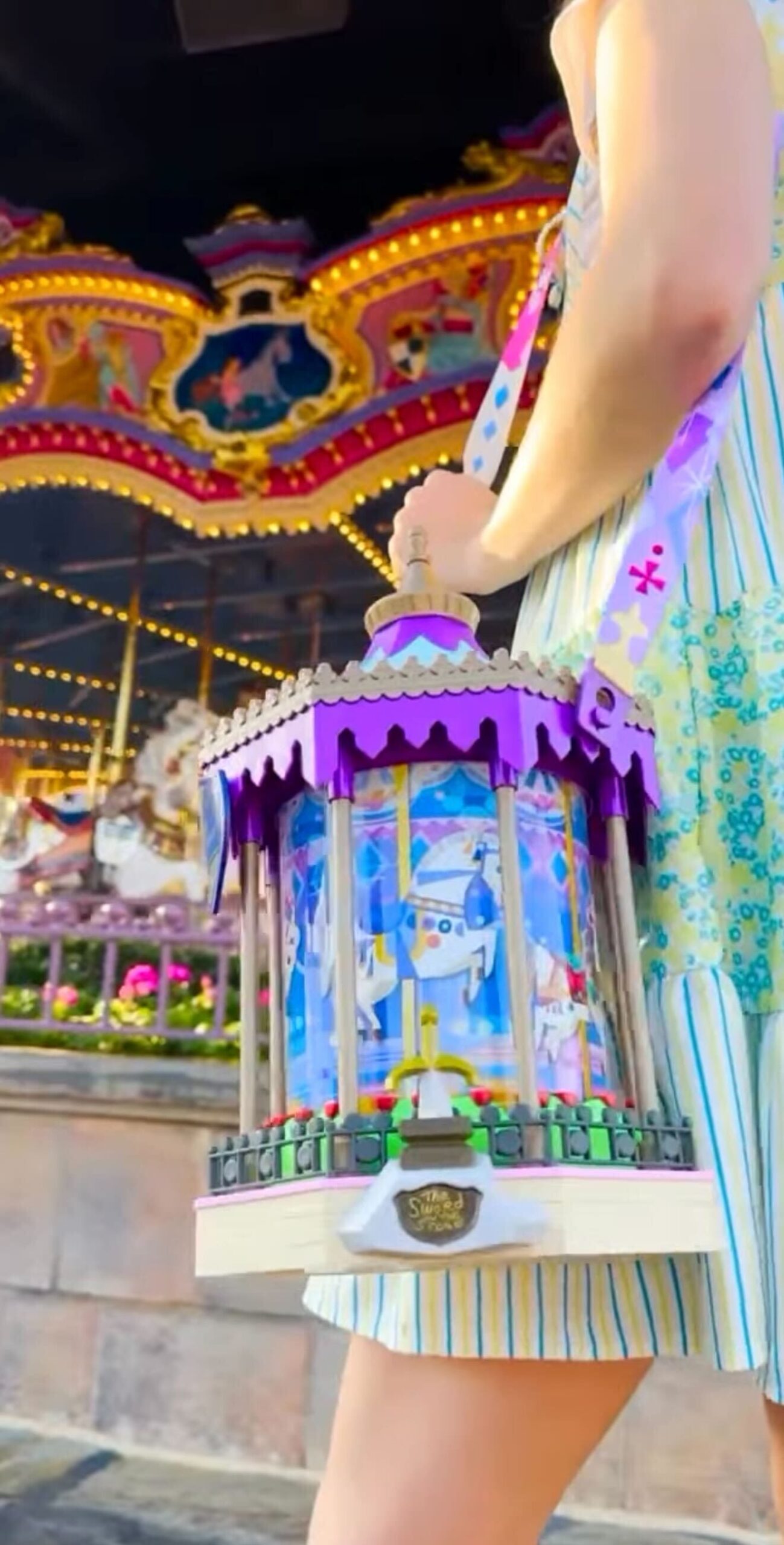 Two images of a carousel-themed lantern with colorful horse illustrations, purple roof, and a small base, displayed against blurred backgrounds of a theme park setting.