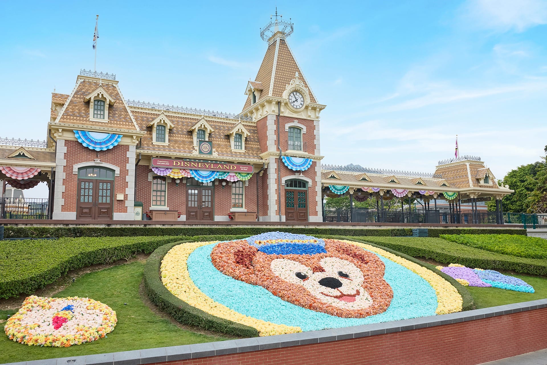 A new floral arrangement in Town Square features Duffy in a train conductor outfit. Figurines of Duffy and Friends are also on display, standing on a train platform with their luggage. A new Duffy-themed flower bed is at Main Street Station.
