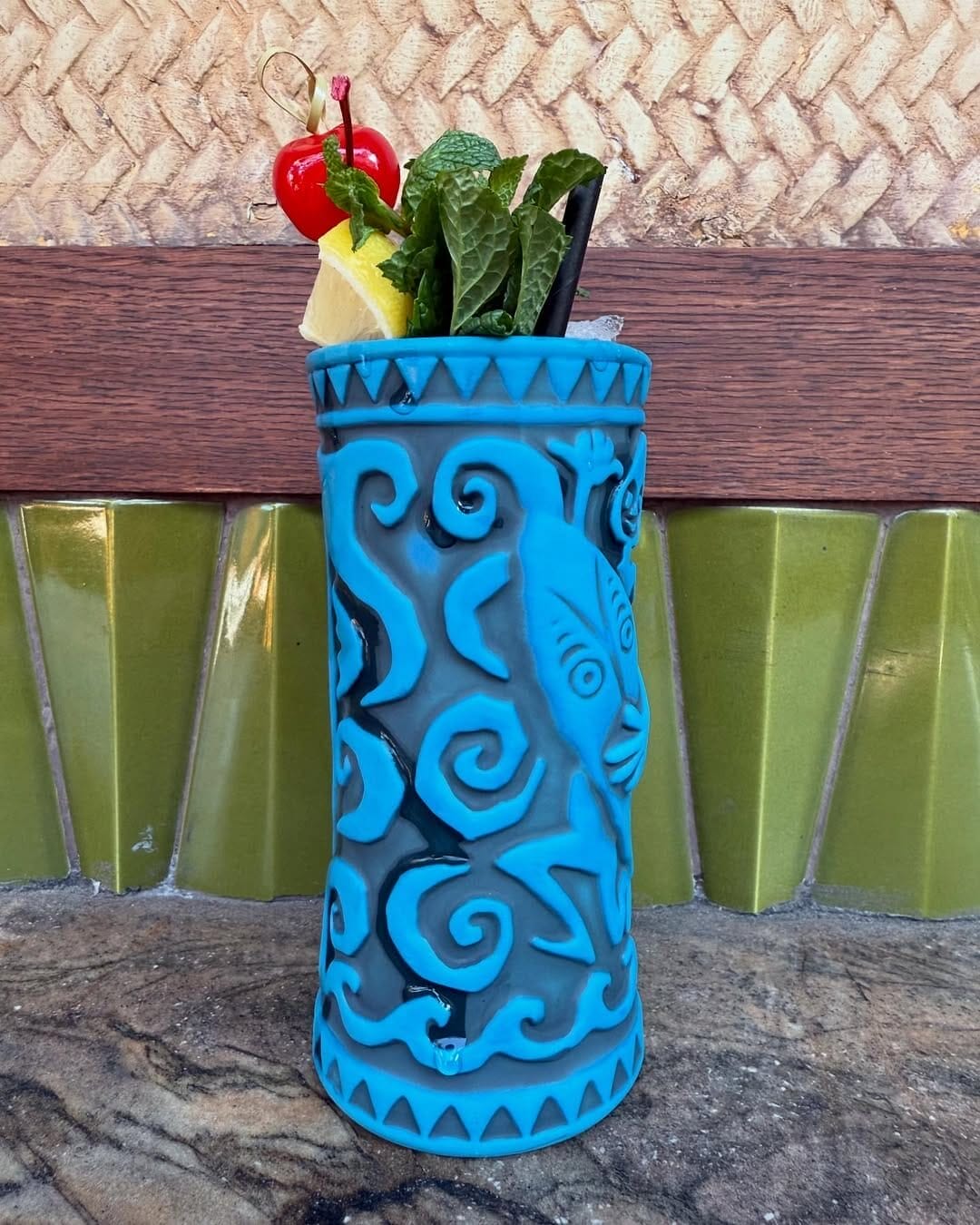 A decorative blue tiki mug with swirling patterns, filled with a green leafy garnish, lemon wedge, cherry, and a straw, sits elegantly on a textured surface—an ideal companion for your daily recap moments.