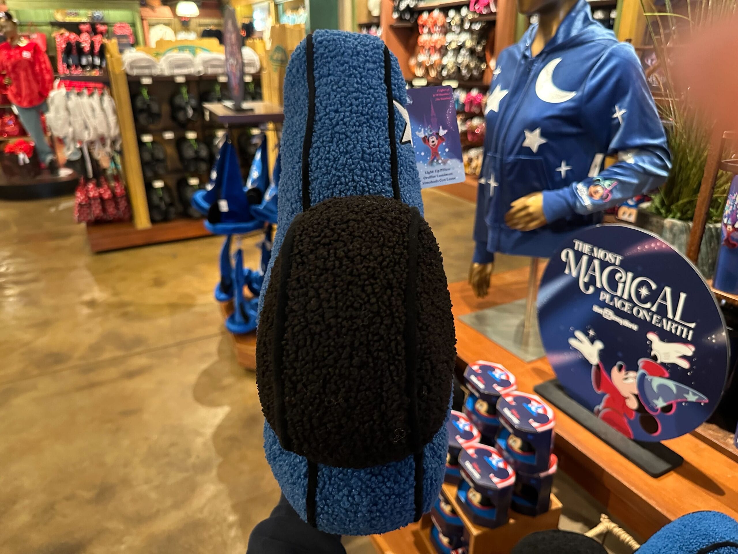 A hand holds a blue sorcerer's hat plush with stars, a moon, and black Mickey ears in a store.