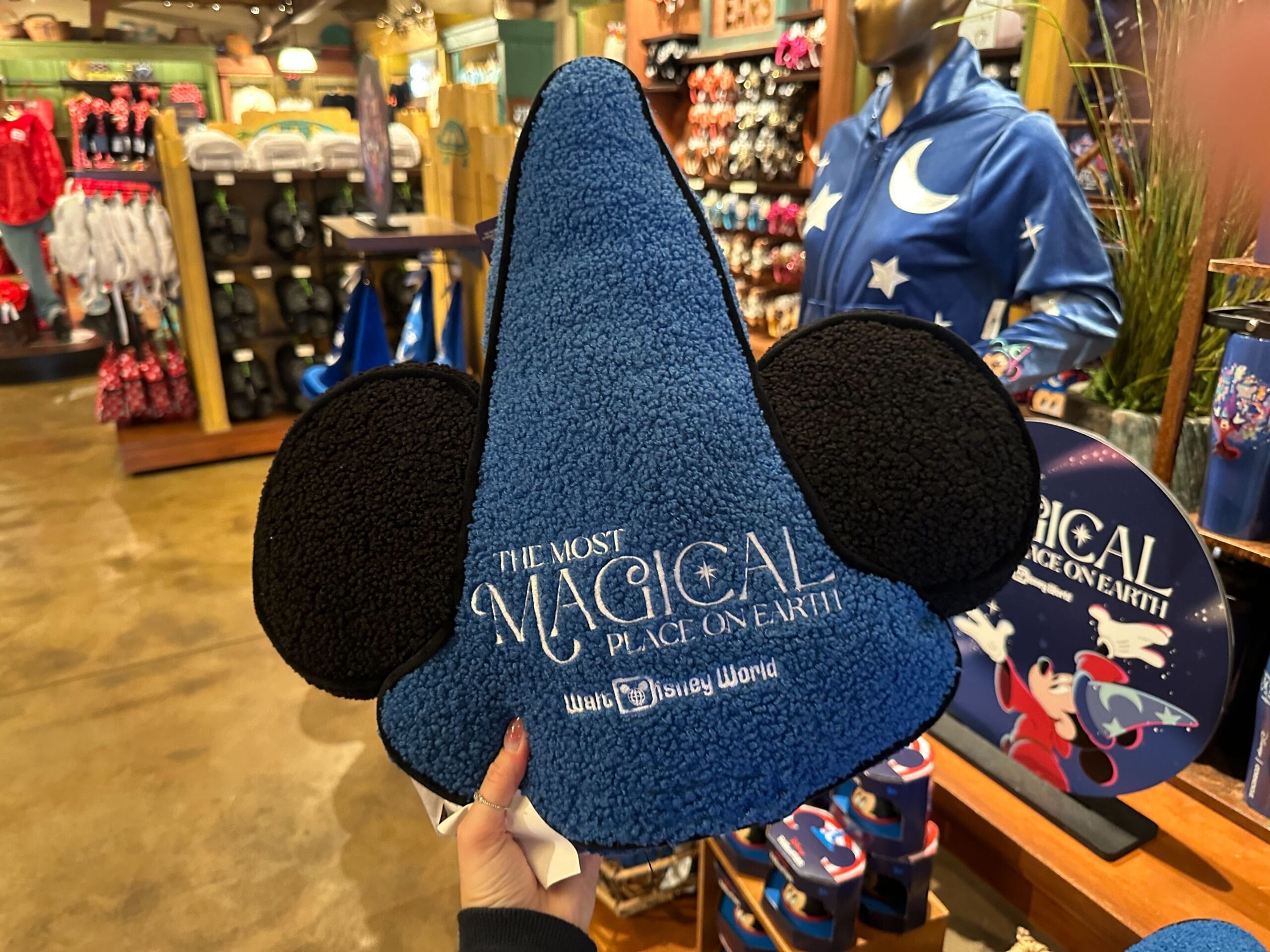 Blue wizard hat with black Mickey ears and the text "The Most Magical Place on Earth! Walt Disney World." Displayed in a store with various Disney merchandise in the background.