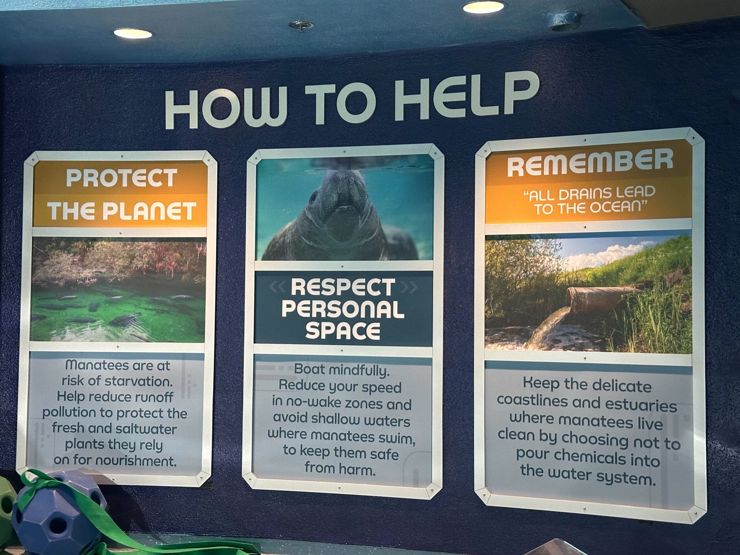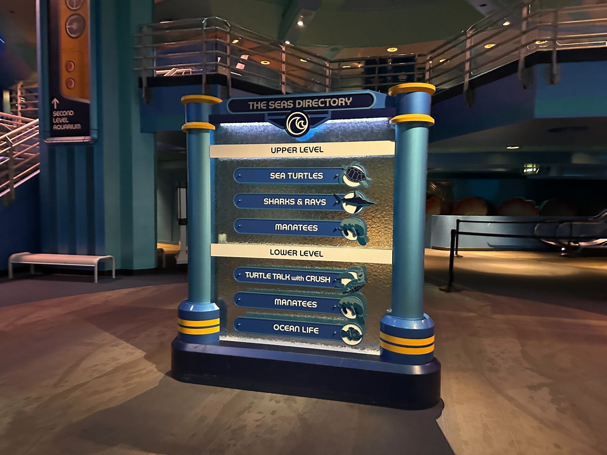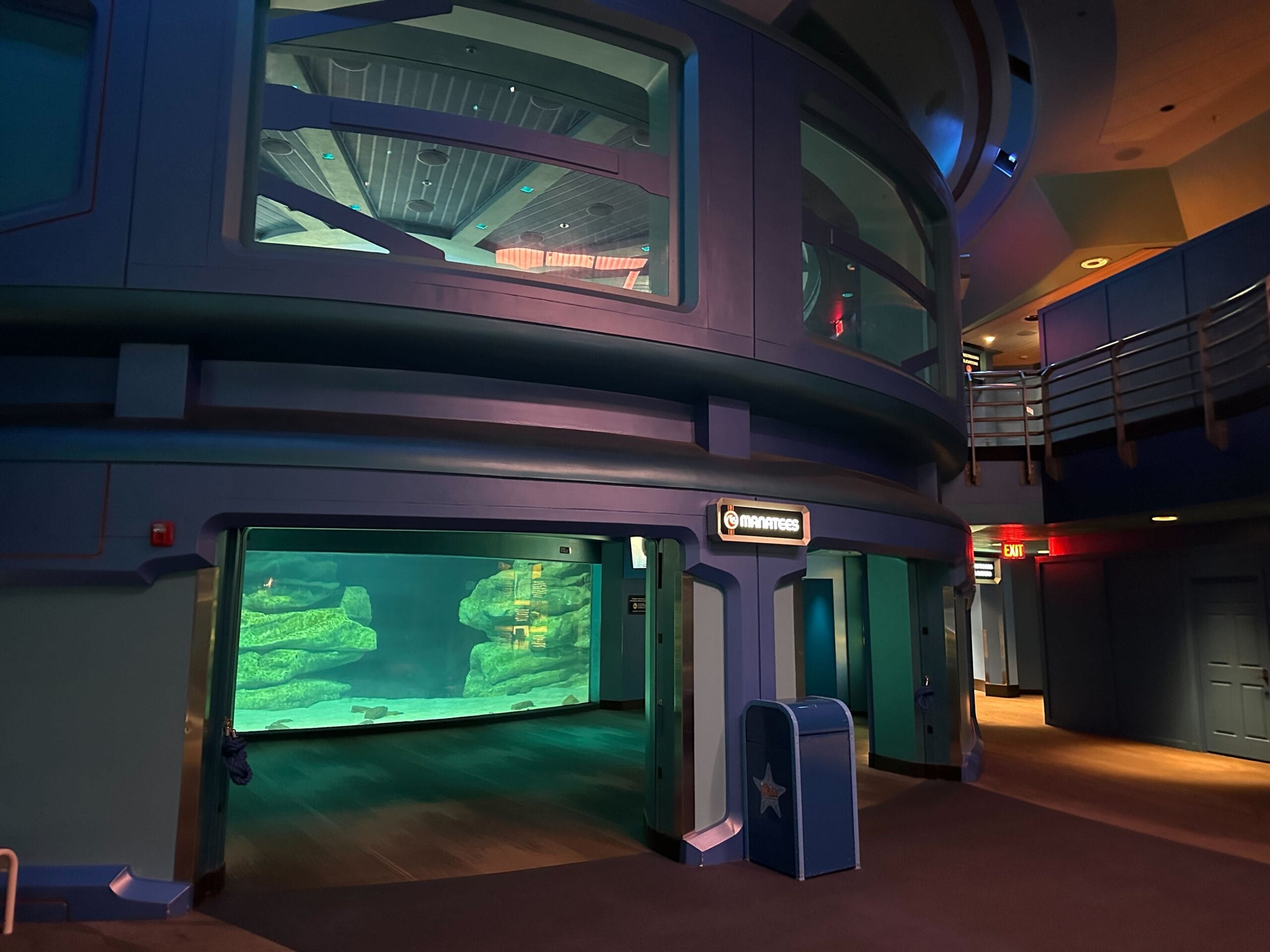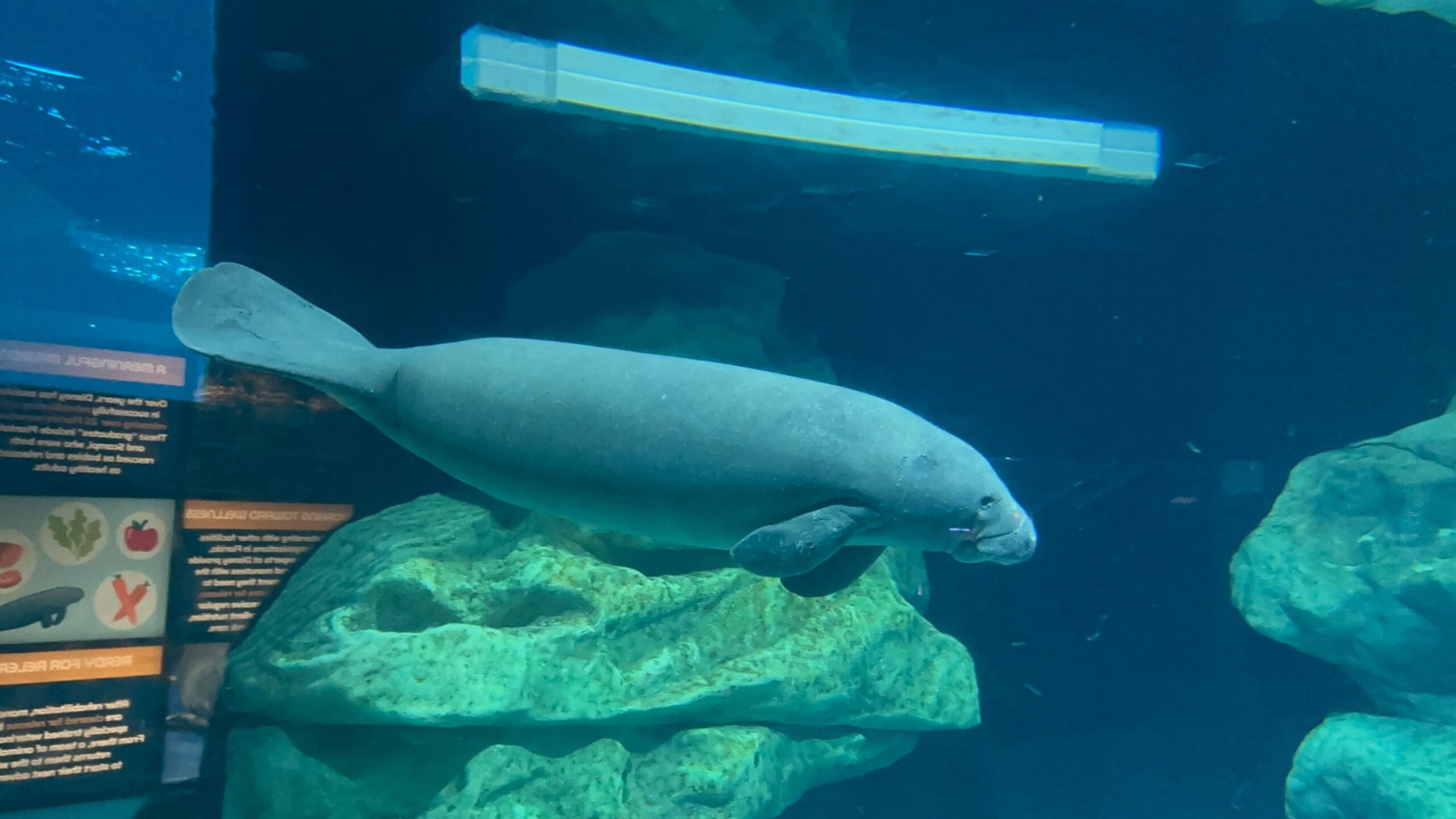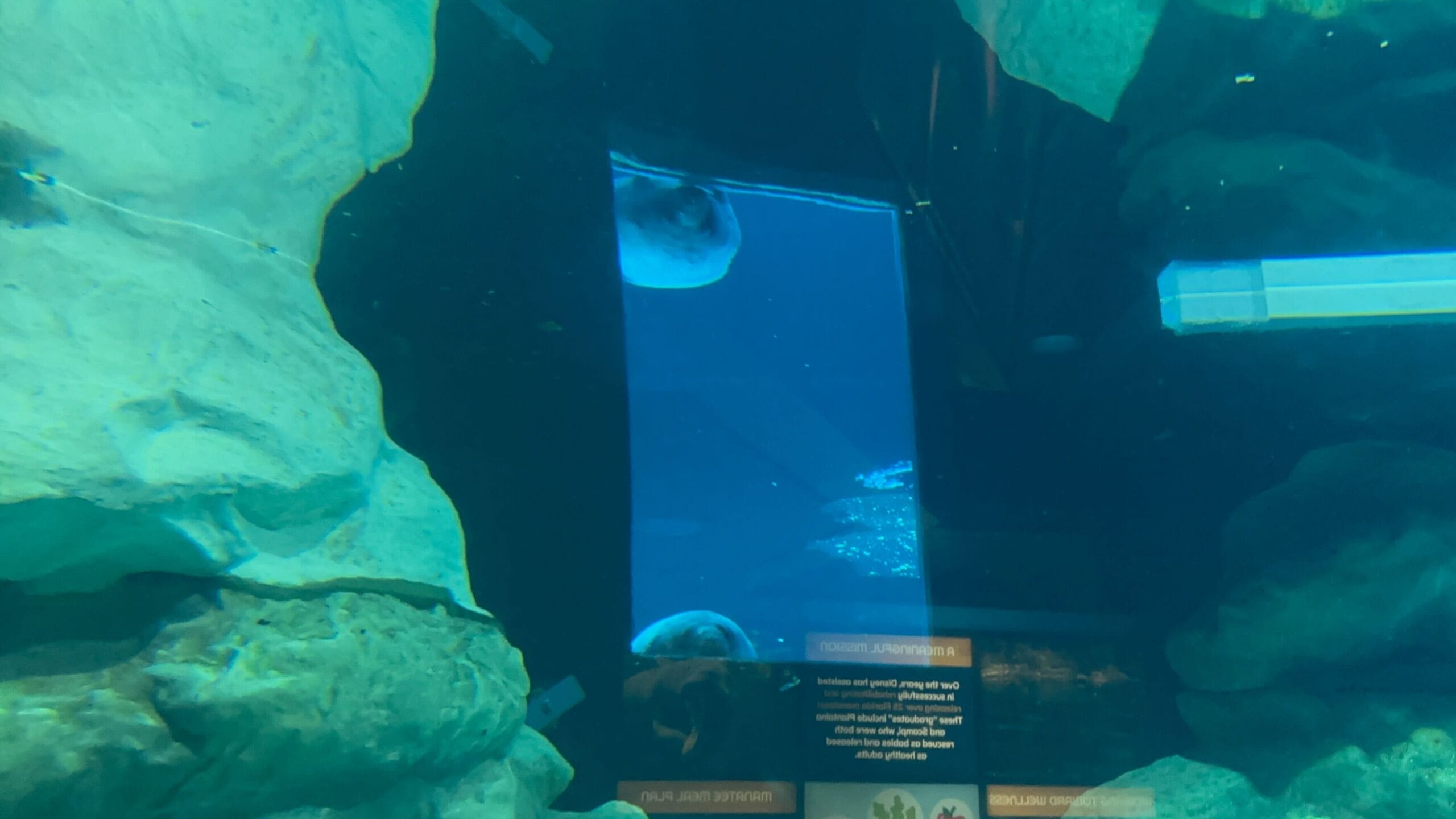 The manatee tank is viewable on the first and second floors of SeaBase Aquarium. Information about the manatees is on a chalkboard in the second-level viewing area. Cast Members will also happily share more information about the animals. There are signs with information about how to help the vulnerable species.