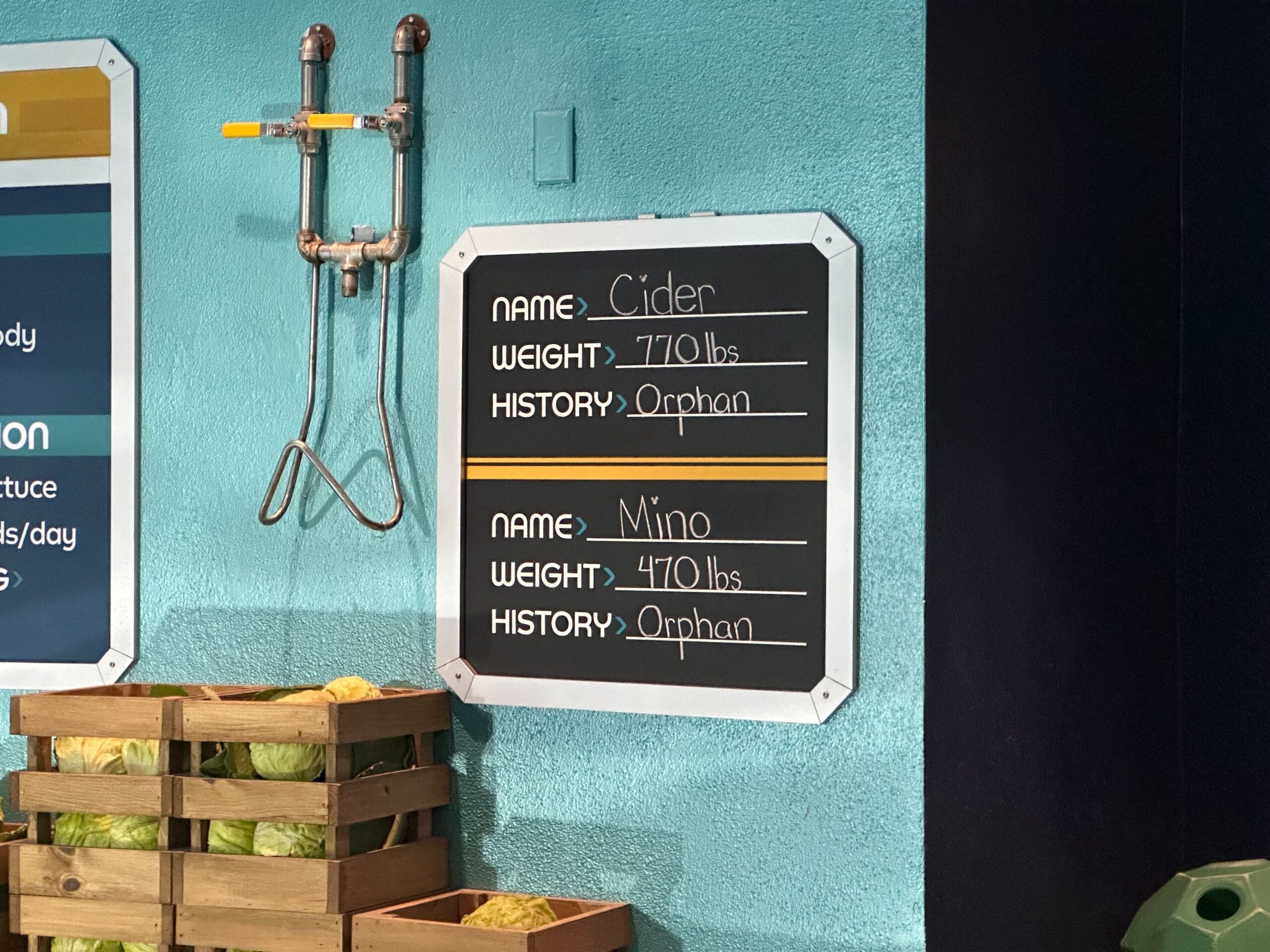 Thursday was Cider and Mino’s first day in this tank and they were wary of coming out into the viewing area. Cast Members fed them lettuce in the back tank and we could see them chomping away through the window.