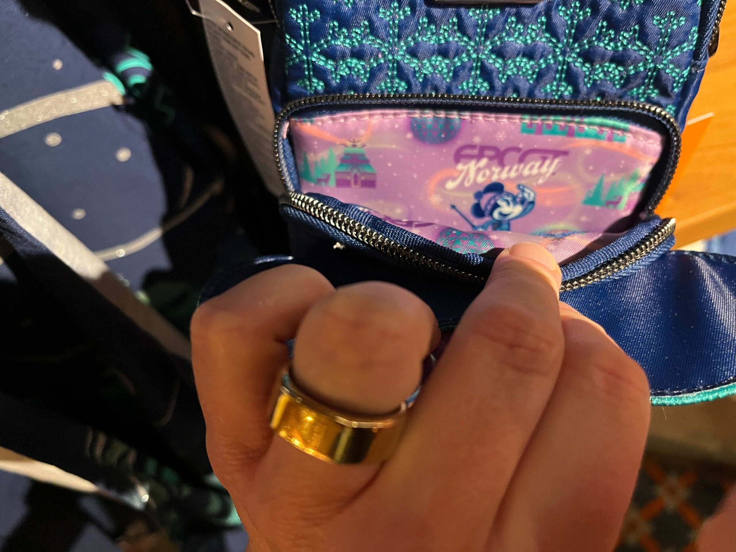 Opening the front pouch we saw the bag’s interior pattern which features an all-over print of Minnie with the EPCOT logo and “Norway” beneath it, Spaceship Earth, and the Norway pavilion Stave Church.