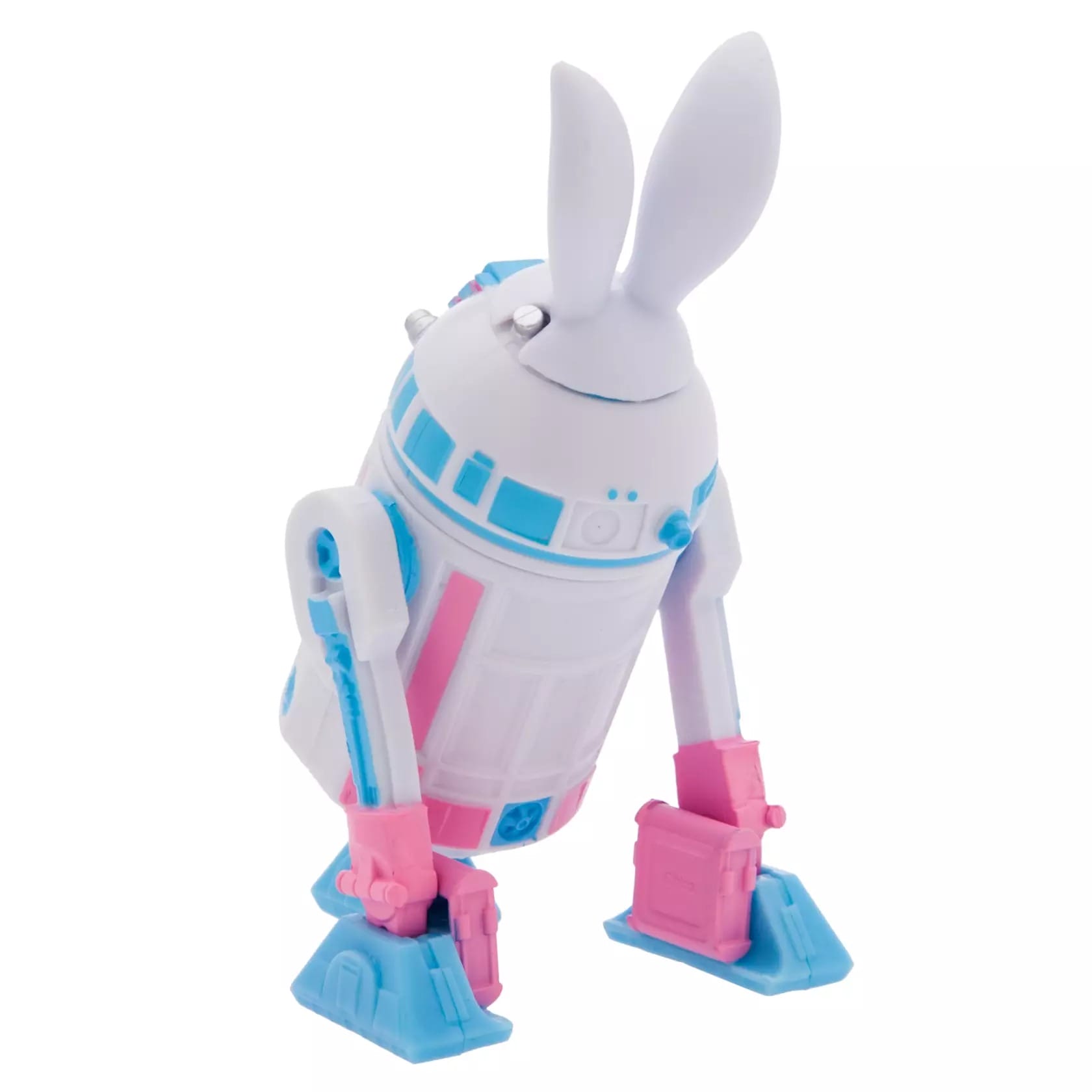 The newest Droid Factory figure, called R2-BNE, is named as a play on the word “bunny.” The figure is made to look ready for spring with a white body and bunny ears stuck to its top dome. The buttons and panels on the droid are colored blue and pink in pastel hues.