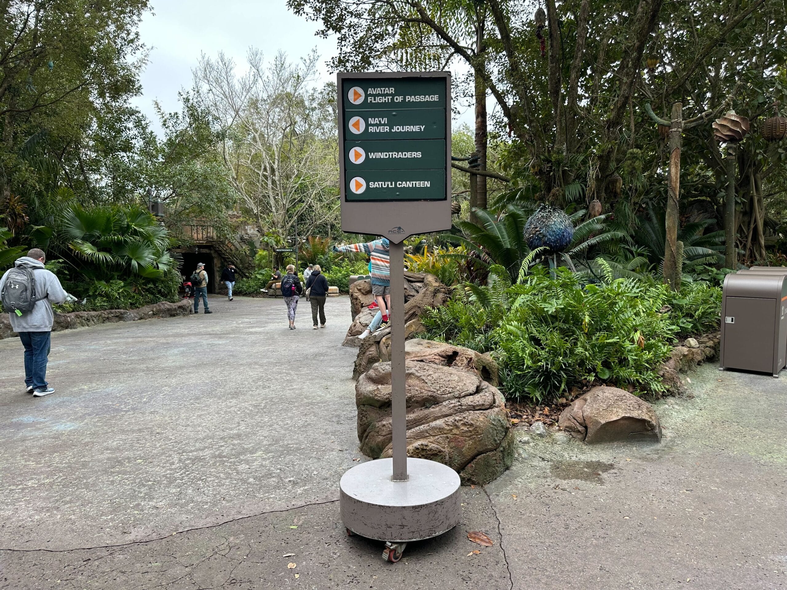 We also noticed a temporary, rolling sign in Pandora – The World of Avatar. It points to the two attractions — Avatar Flight of Passage and Na’vi River Journey — as well as the Windtraders gift shop and Satu’li Canteen. The sign may be in place so when more pathways are blocked off, guests can still easily find the land’s venues.