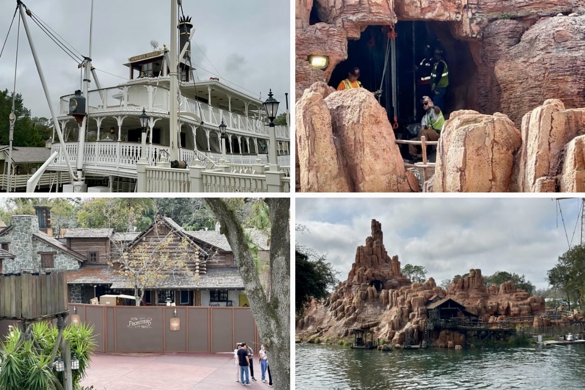 At 11 a.m. I was on the Liberty Belle Riverboat, which gives a particularly good view of the DVC Lounge construction and the Big Thunder Mountain Railroad refurbishment. Peep the construction worker waving to the guests on the riverboat. He is in the same spot as the newly laid track we previously reported last week.