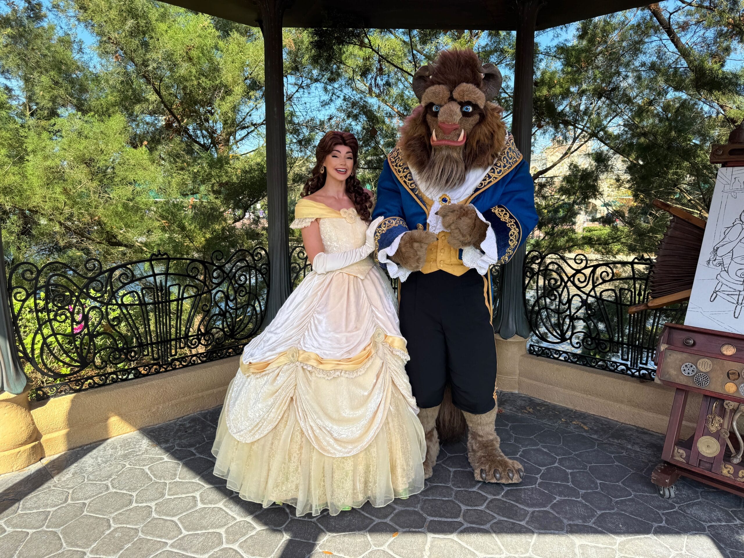 We met Belle and the Beast at the France Pavilion in EPCOT. The couple rotates through the same gazebo meet and greet area as Princess Aurora and Prince Philip, so you might have to wait a little while if you want to meet both couples at the France Pavilion.