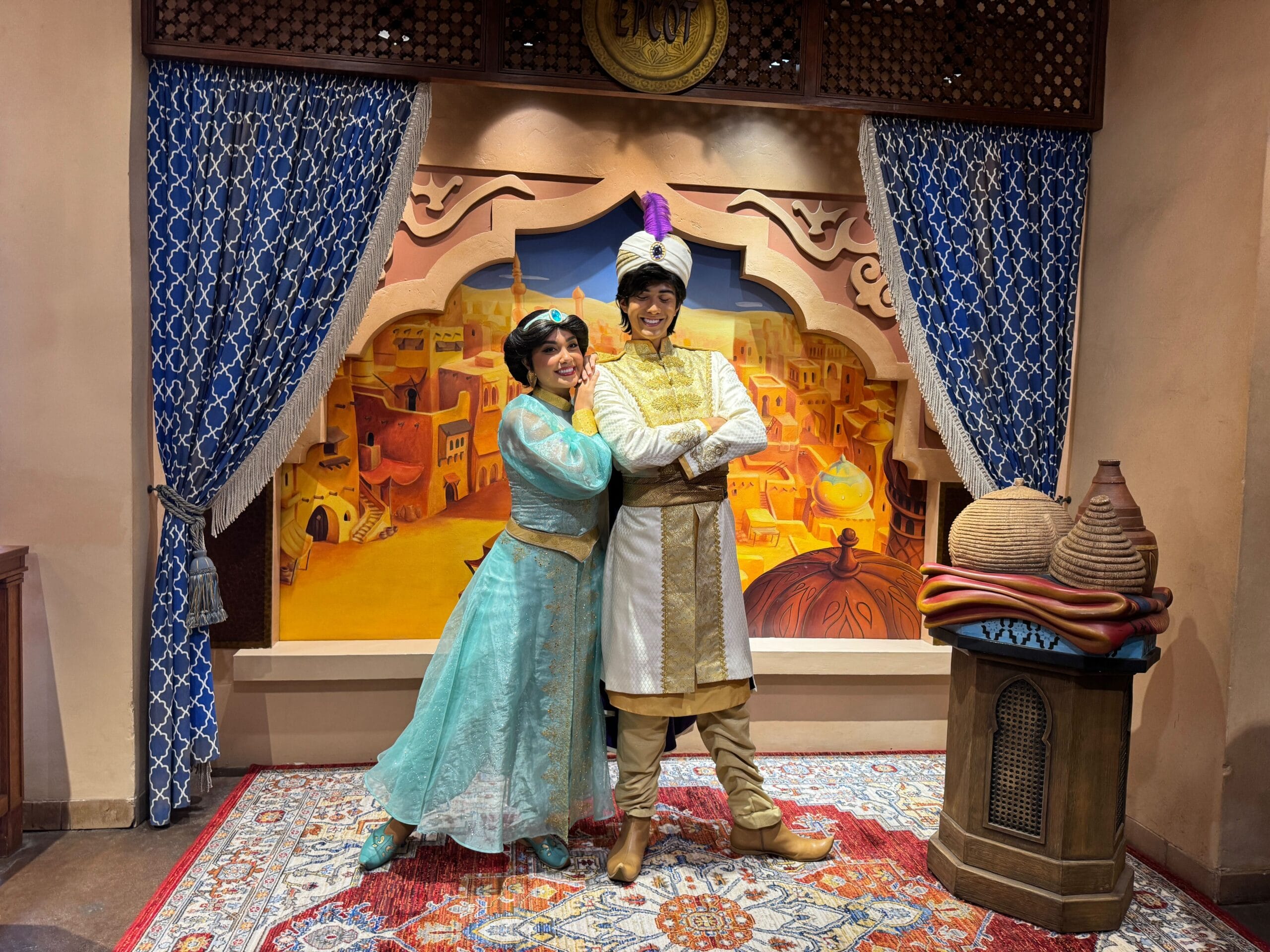 Princess Jasmine and Aladdin have a meet and greet location inside the Morocco pavilion this year. Jasmine is wearing her classic blue outfit, while Aladdin is in his more formal Prince Ali attire.