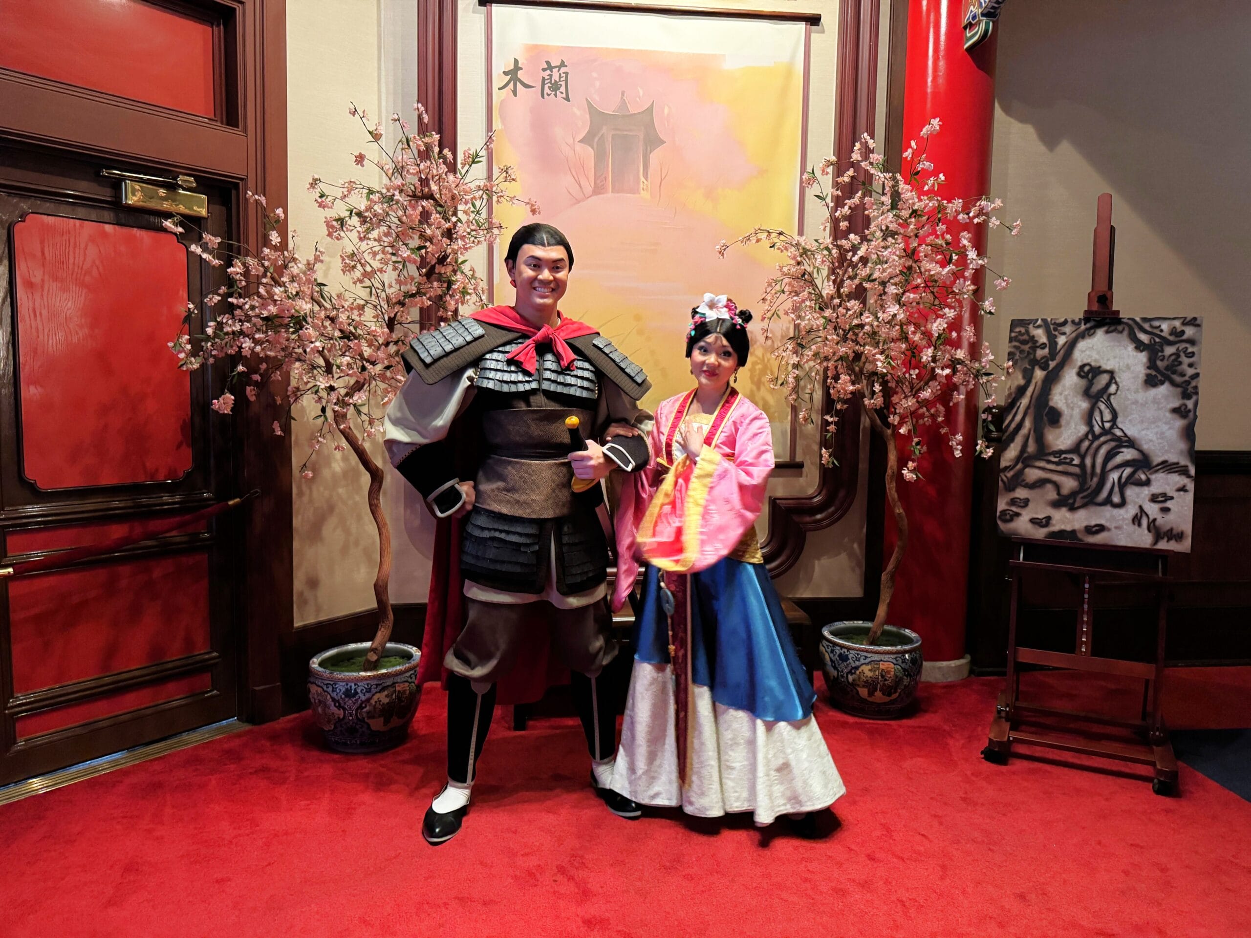 Mulan and Li Shang are also meeting this year, in the China pavilion. Shang wears his battle armor, sword in hand, while Mulan opts for her pink and blue formal wear.