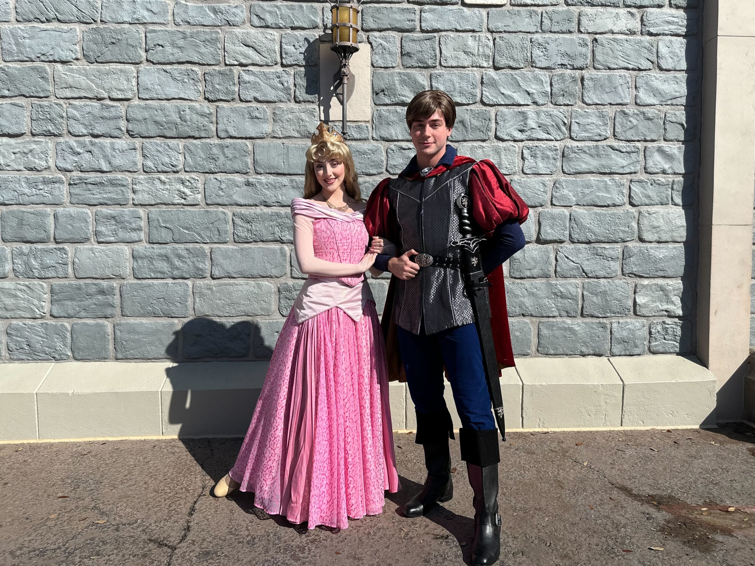 Princess Aurora, also known as Sleeping Beauty, and Prince Phillip were waving hello to guests behind Cinderella Castle. They stood in front of a section of stone wall near Pinocchio Village Haus.