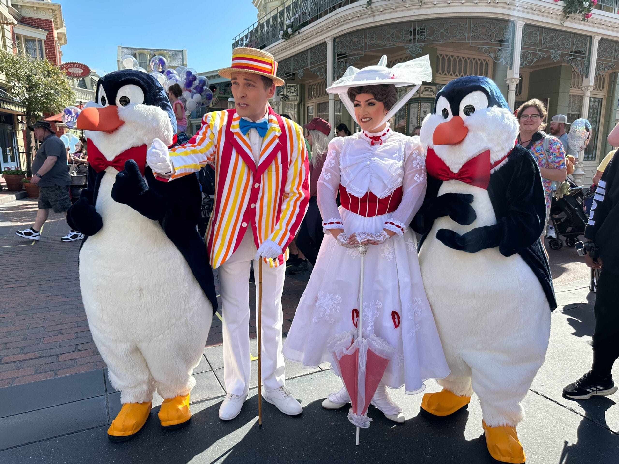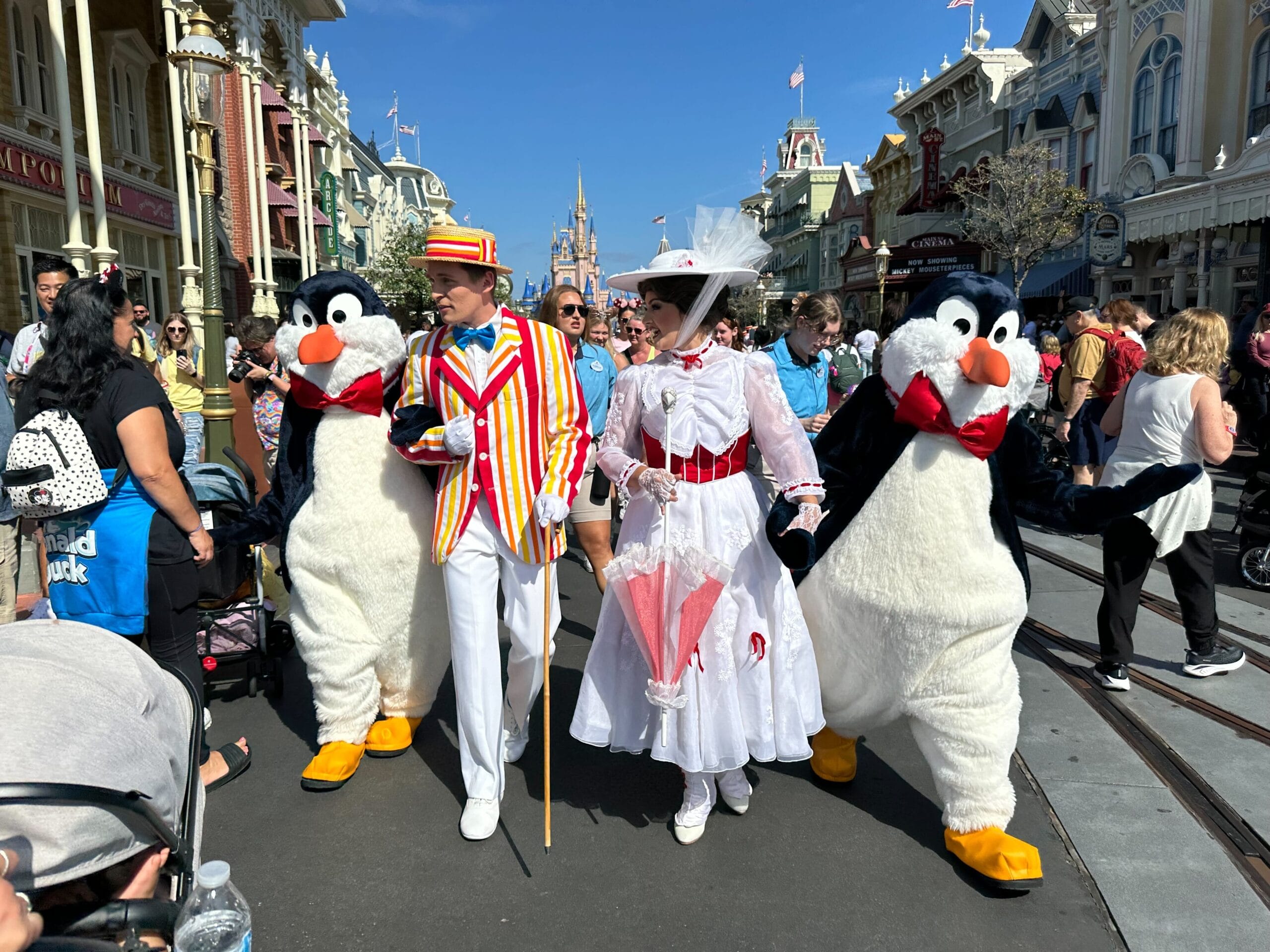 One popular new addition to this year’s Valentine’s Day character lineup is Mary Poppins, alongside Bert and two penguins. Mary, Bert, and their penguin pals had linked their arms and were walking down Main Street, U.S.A. while waving to guests.