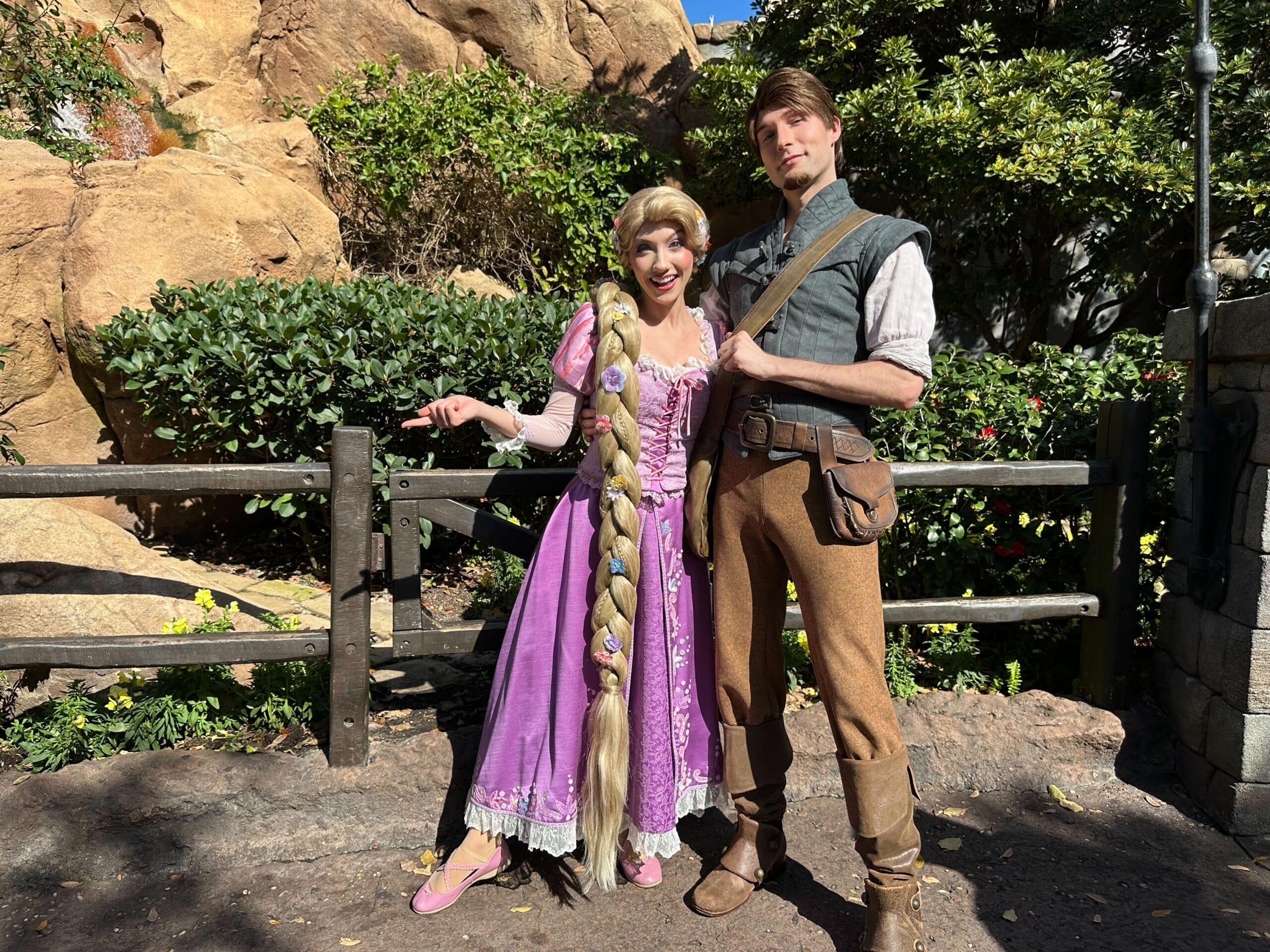 Rapunzel and Flynn were showing off Flynn’s smolder under her tower, which is located to the left of the “Tangled” restrooms in Fantasyland.