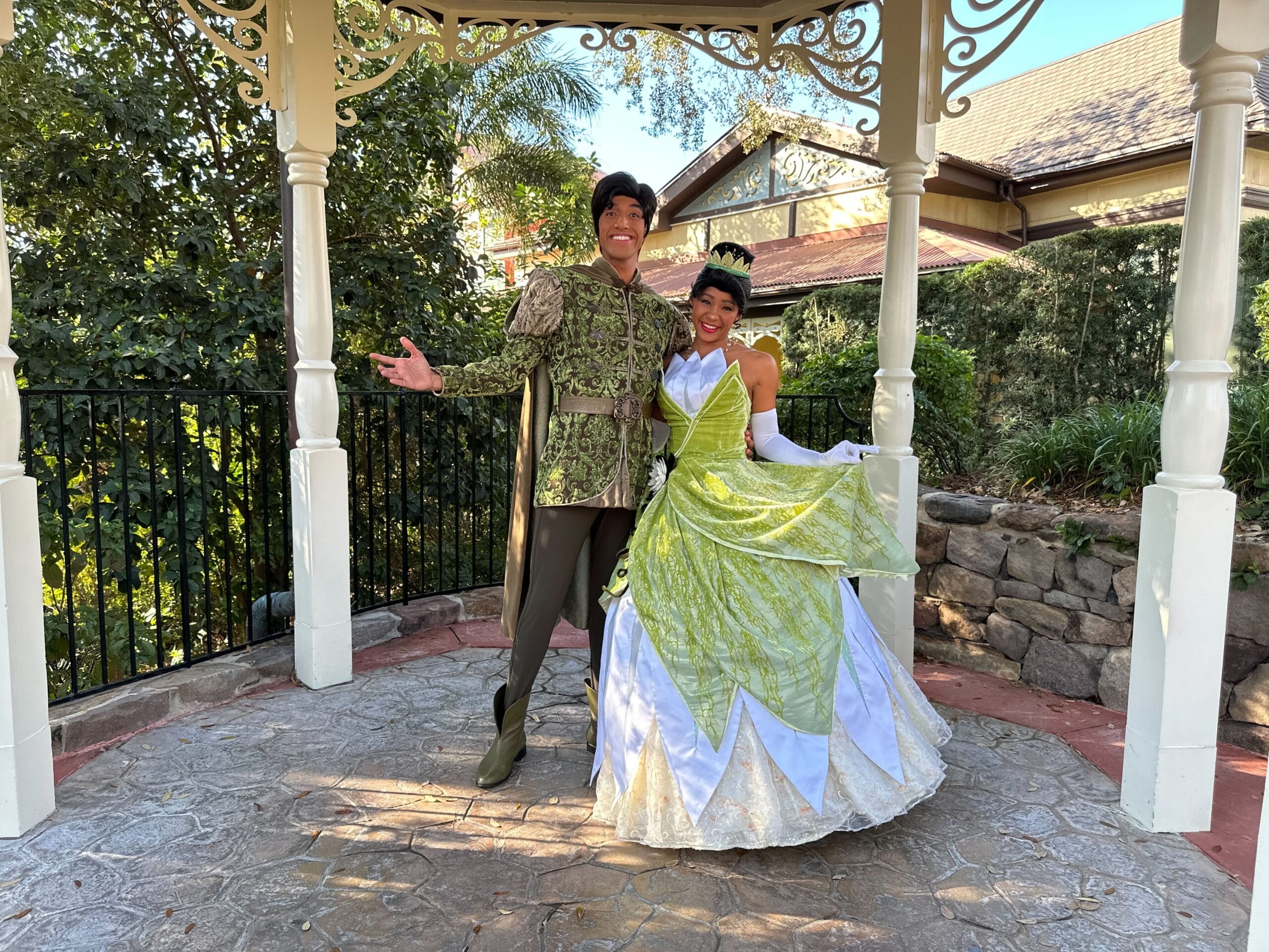 Tiana was wearing her lily pad-inspired finale dress, and Naveen was wearing a matching green doublet with detailed embroidery.