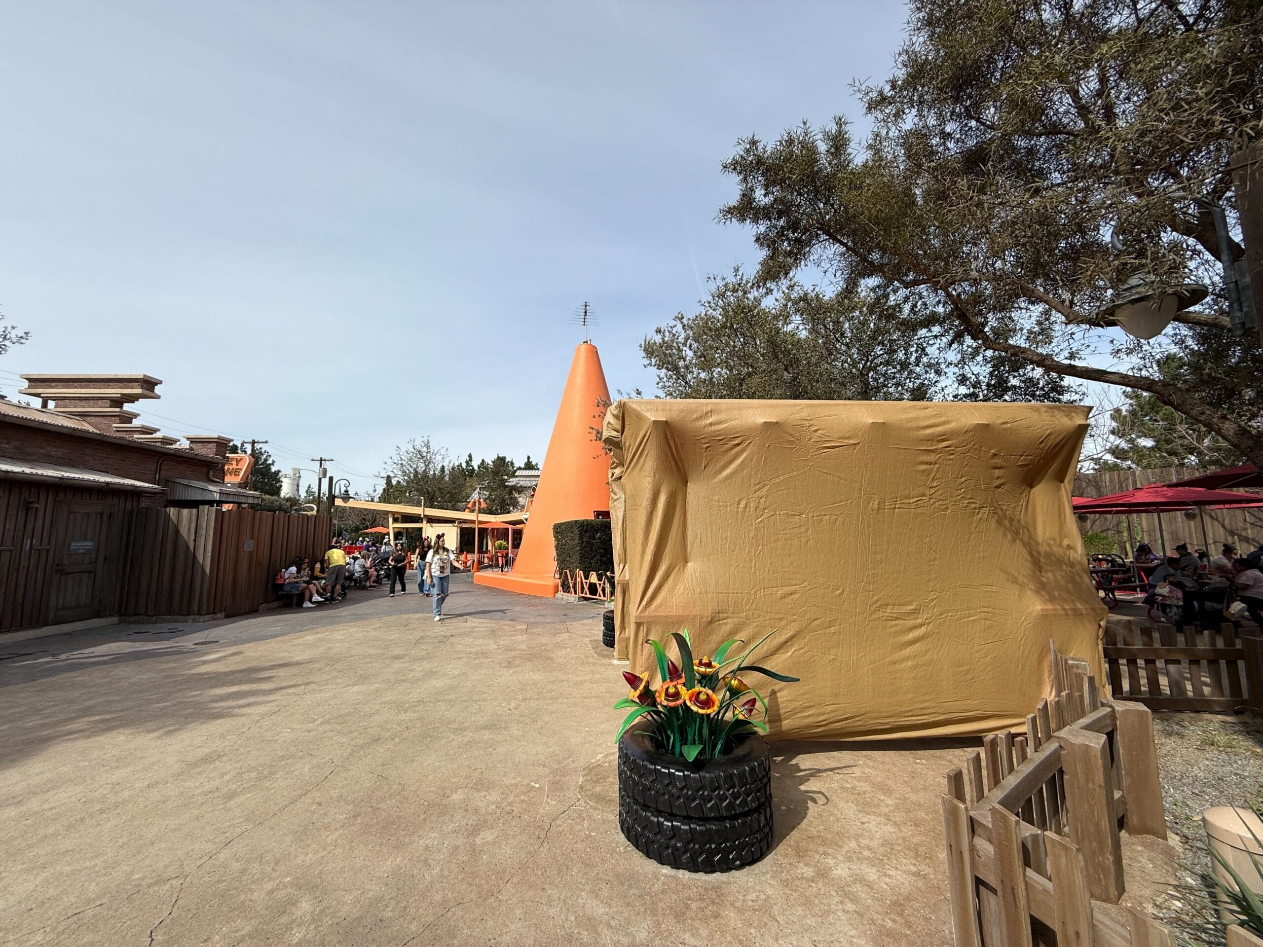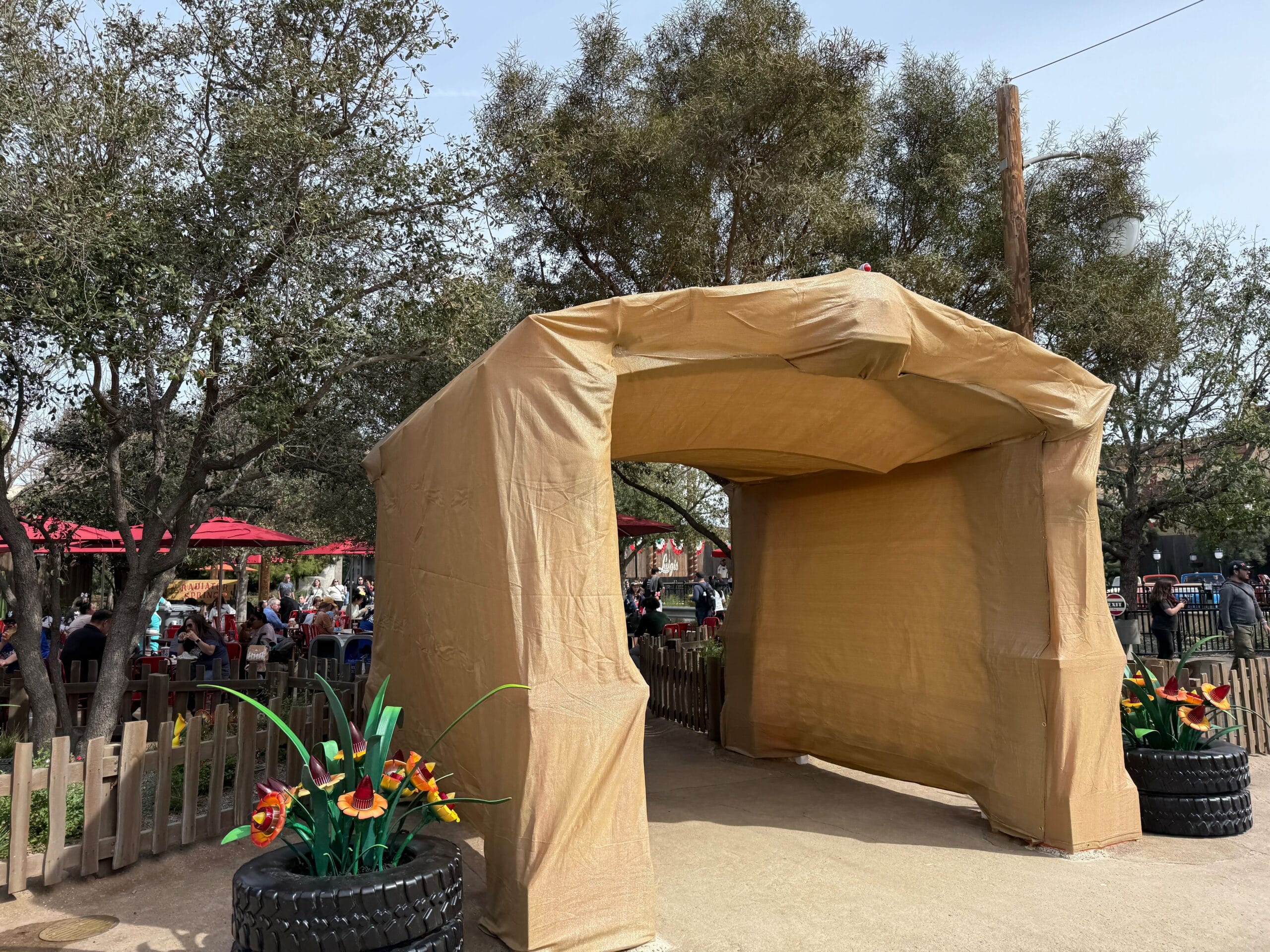 During a recent visit to Cars Land last week, we noticed the pergola was completely covered in tan scrim.