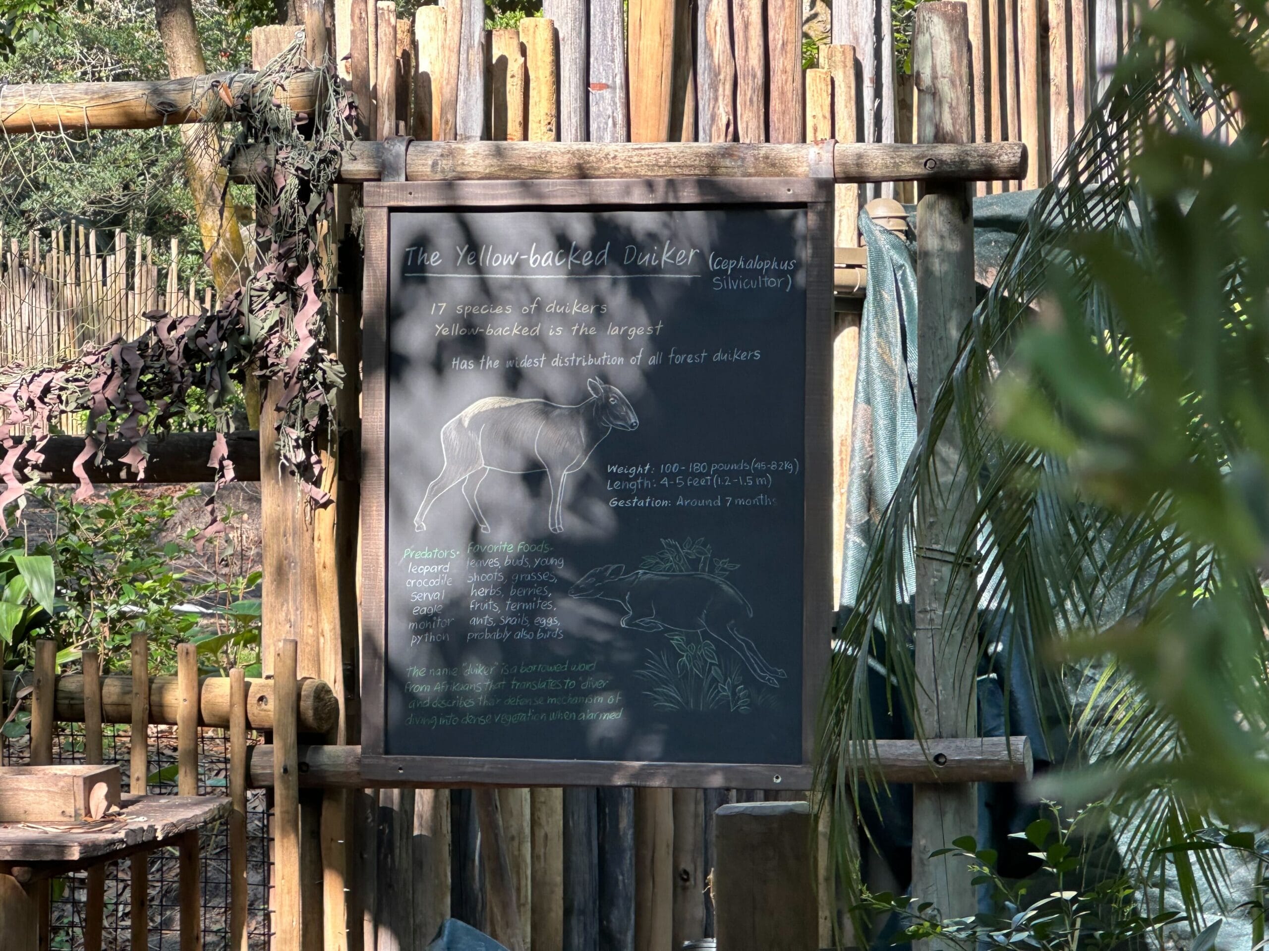 The sign also provides information on the animal’s weight, length, gestation, predators, and favorite foods. Near the bottom of the sign is a blurb explaining where the name “duiker” came from stating that it “is a borrowed word from Afrikaans that translates to ‘diver’ and describes their defense mechanism of diving into dense vegetation when alarmed.”