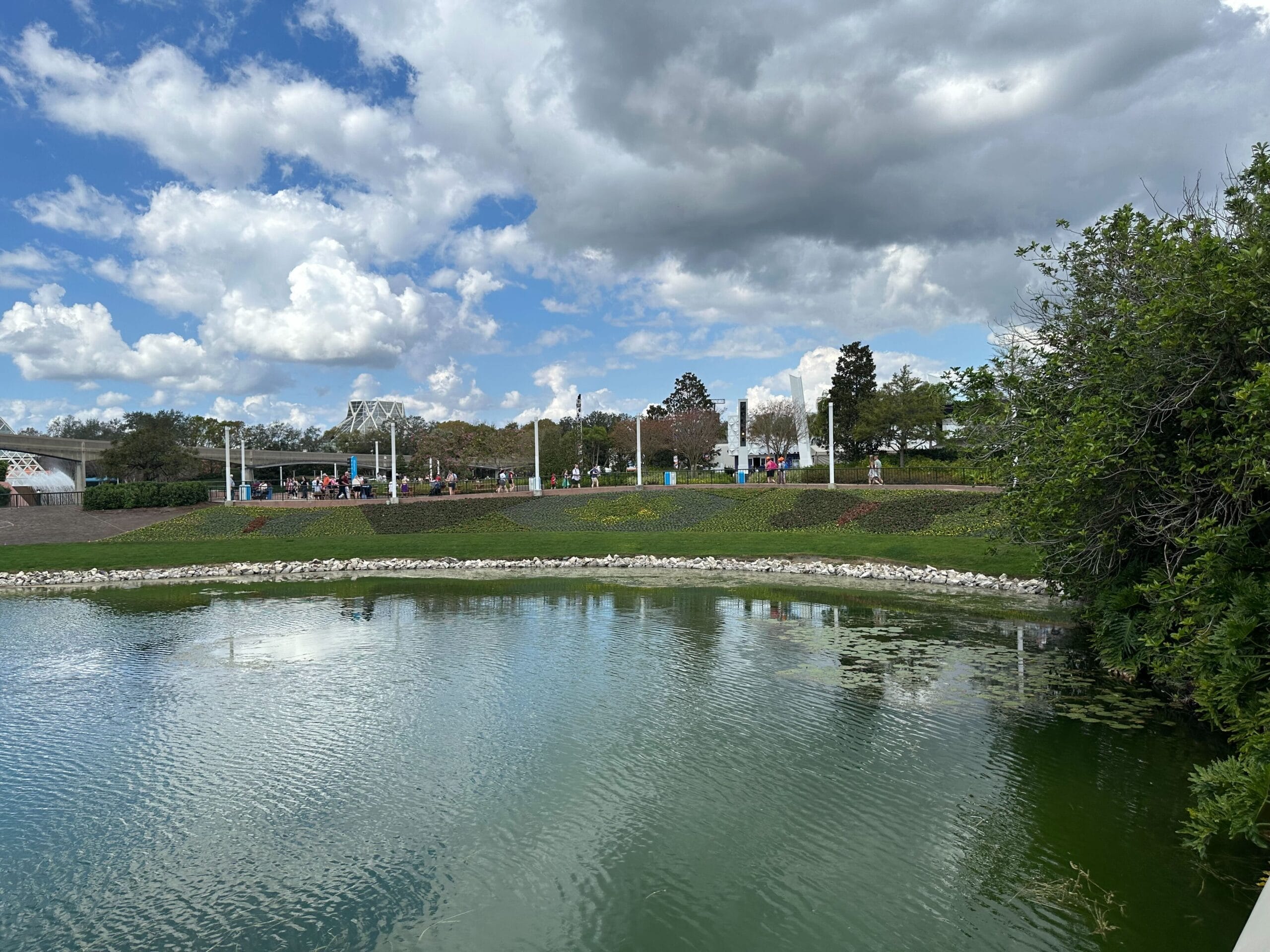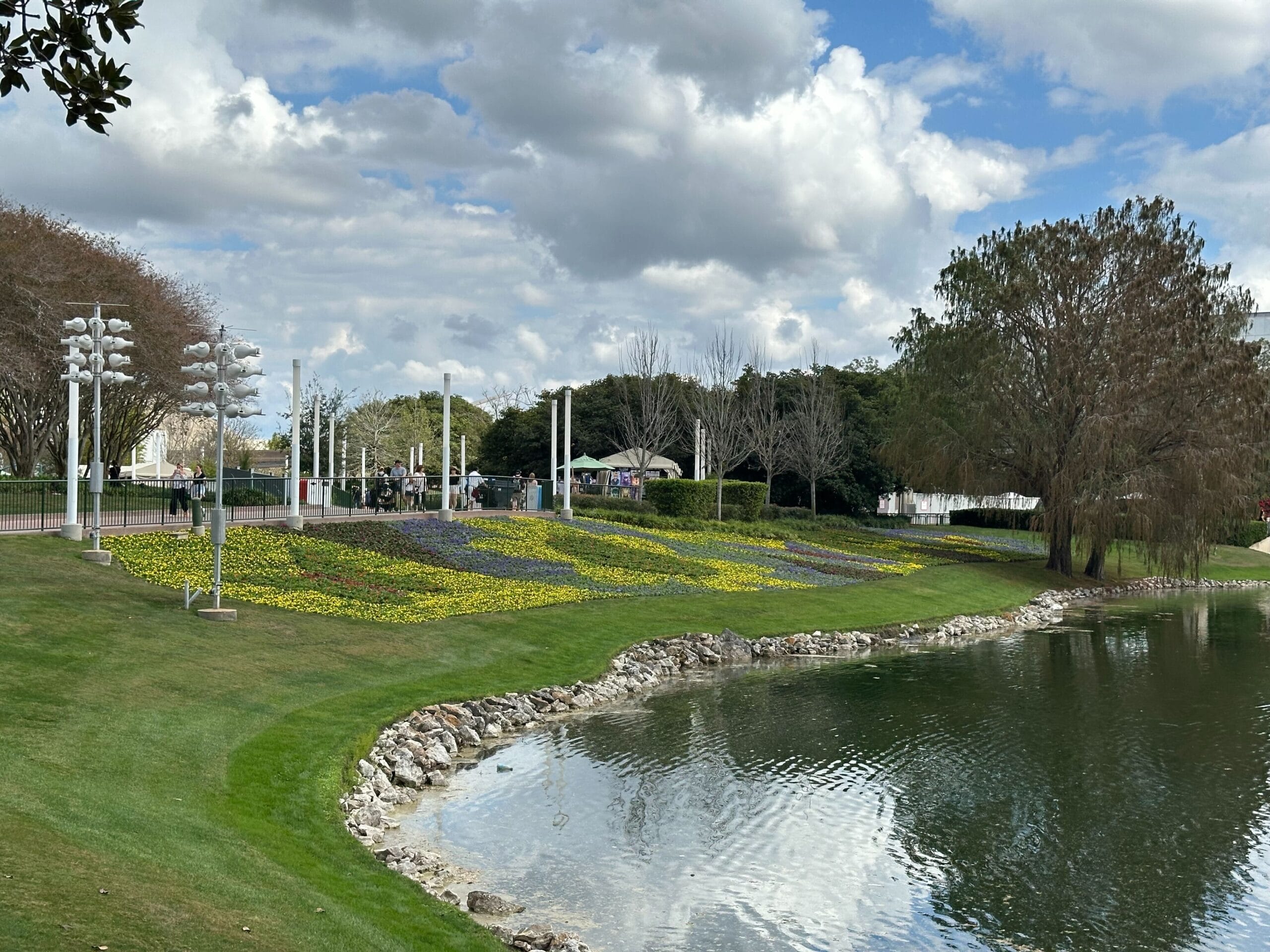By the water near the Odyssey pavilion, the butterfly and flower-shaped displays appear to be complete.